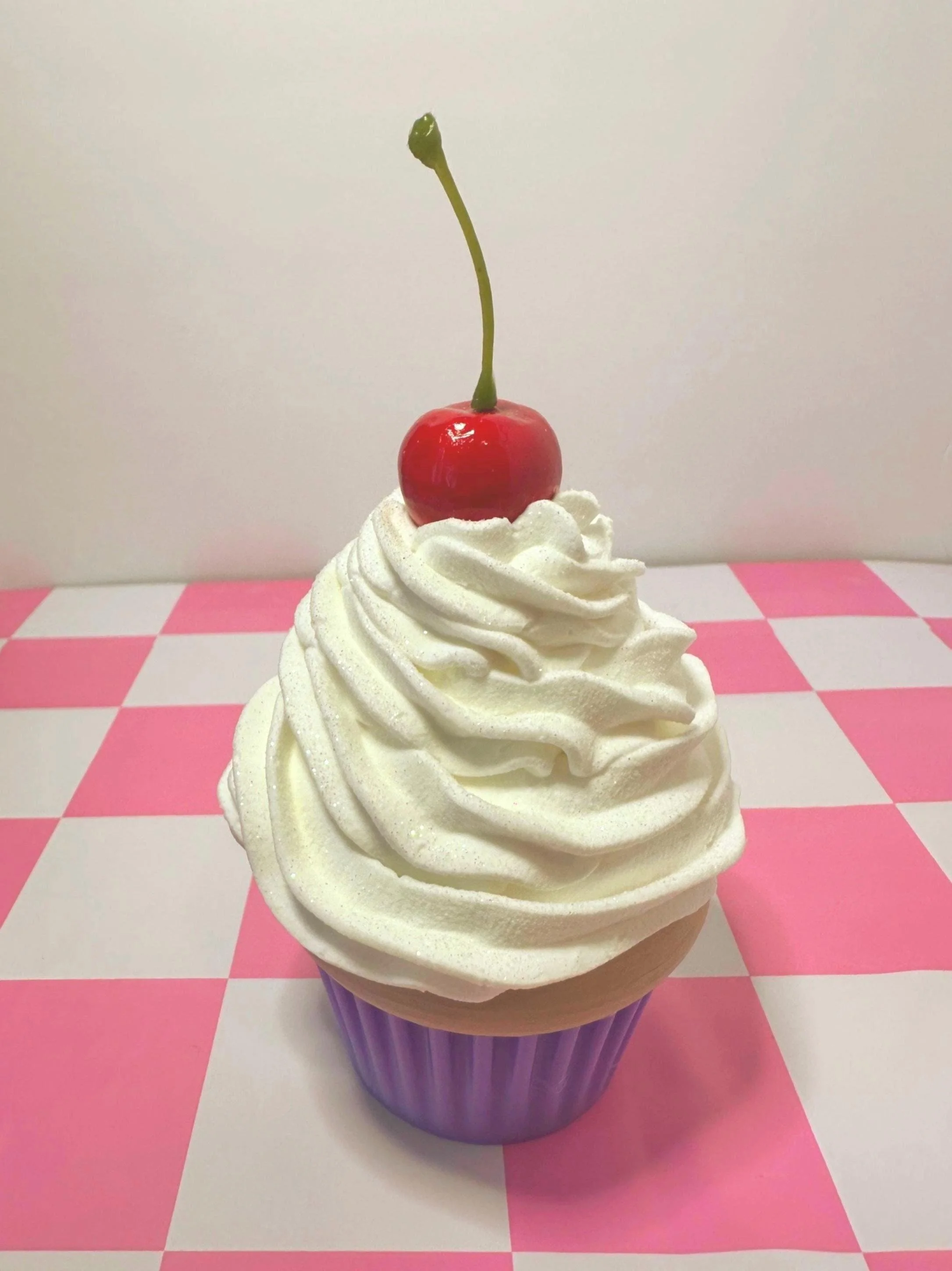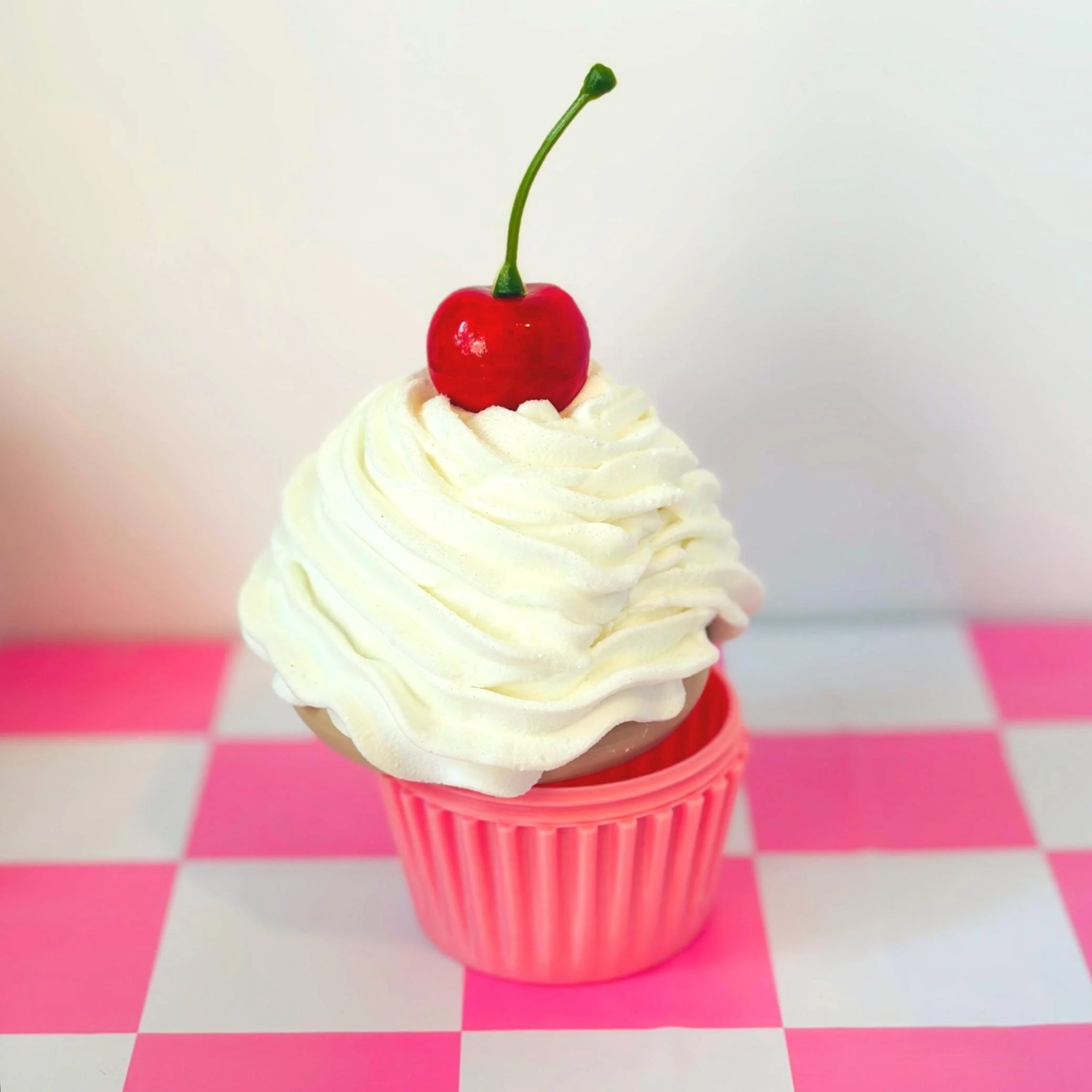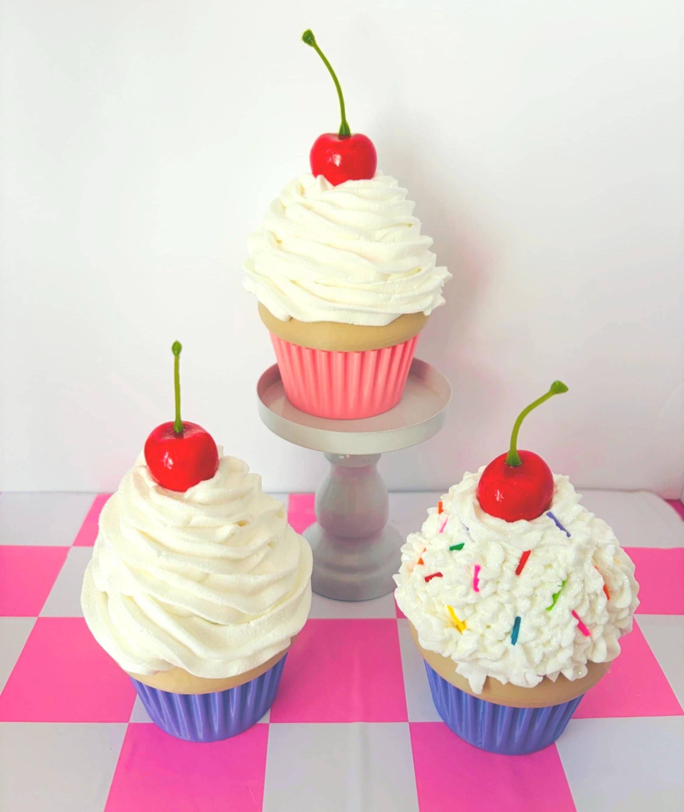 Each cupcake is piped by hand with soft “whipped cream” texture and topped with a glossy cherry.