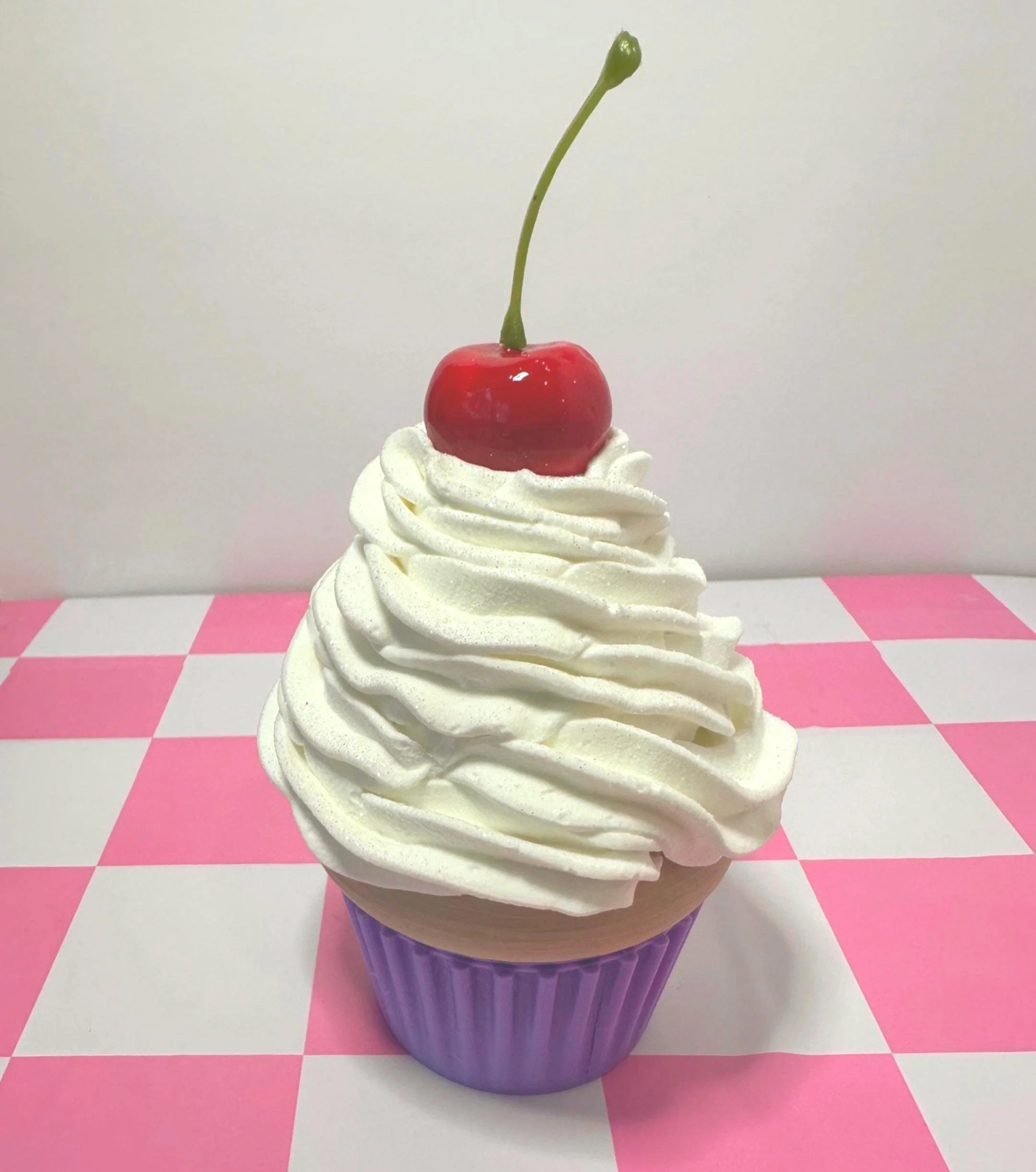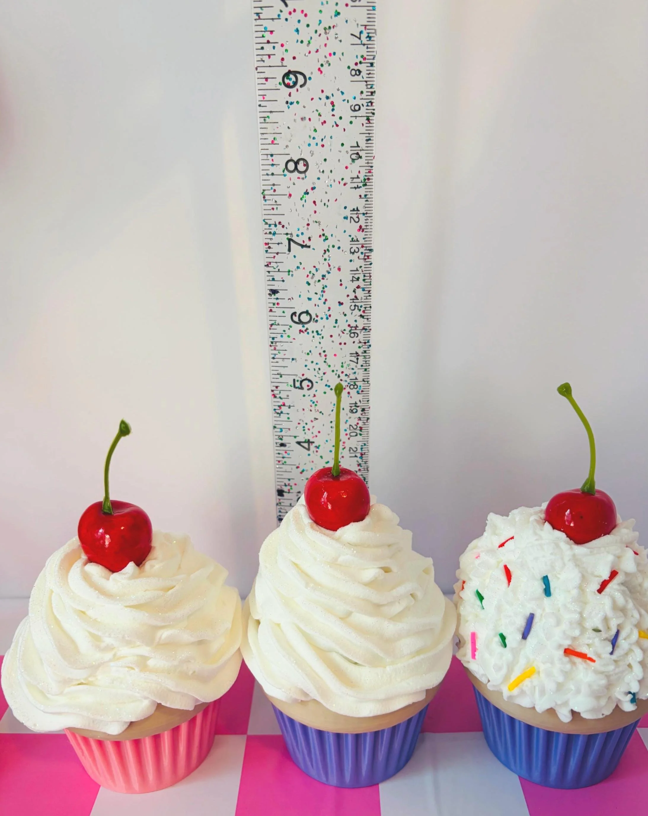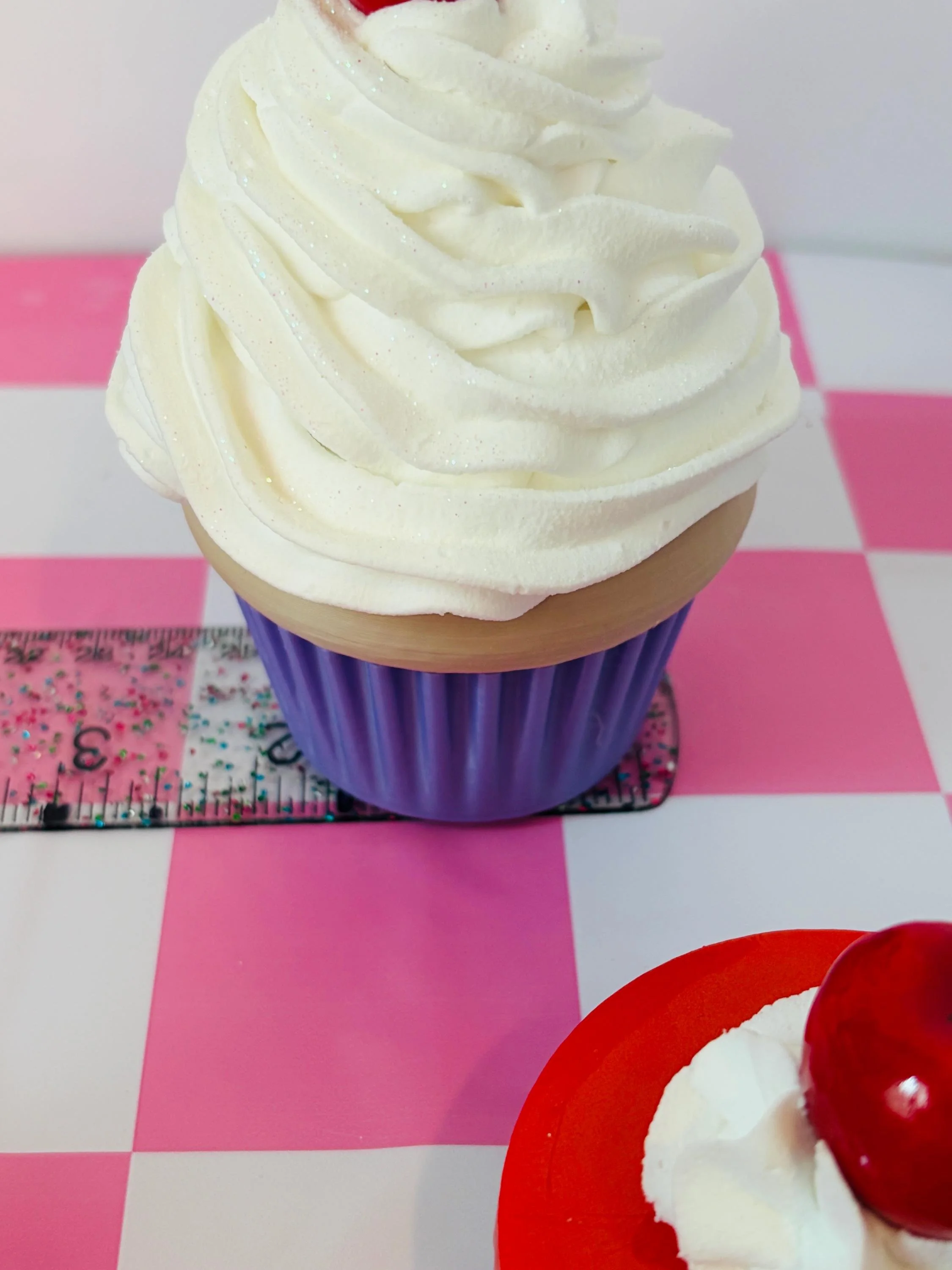 Each cupcake is piped by hand with soft “whipped cream” texture and topped with a glossy cherry.