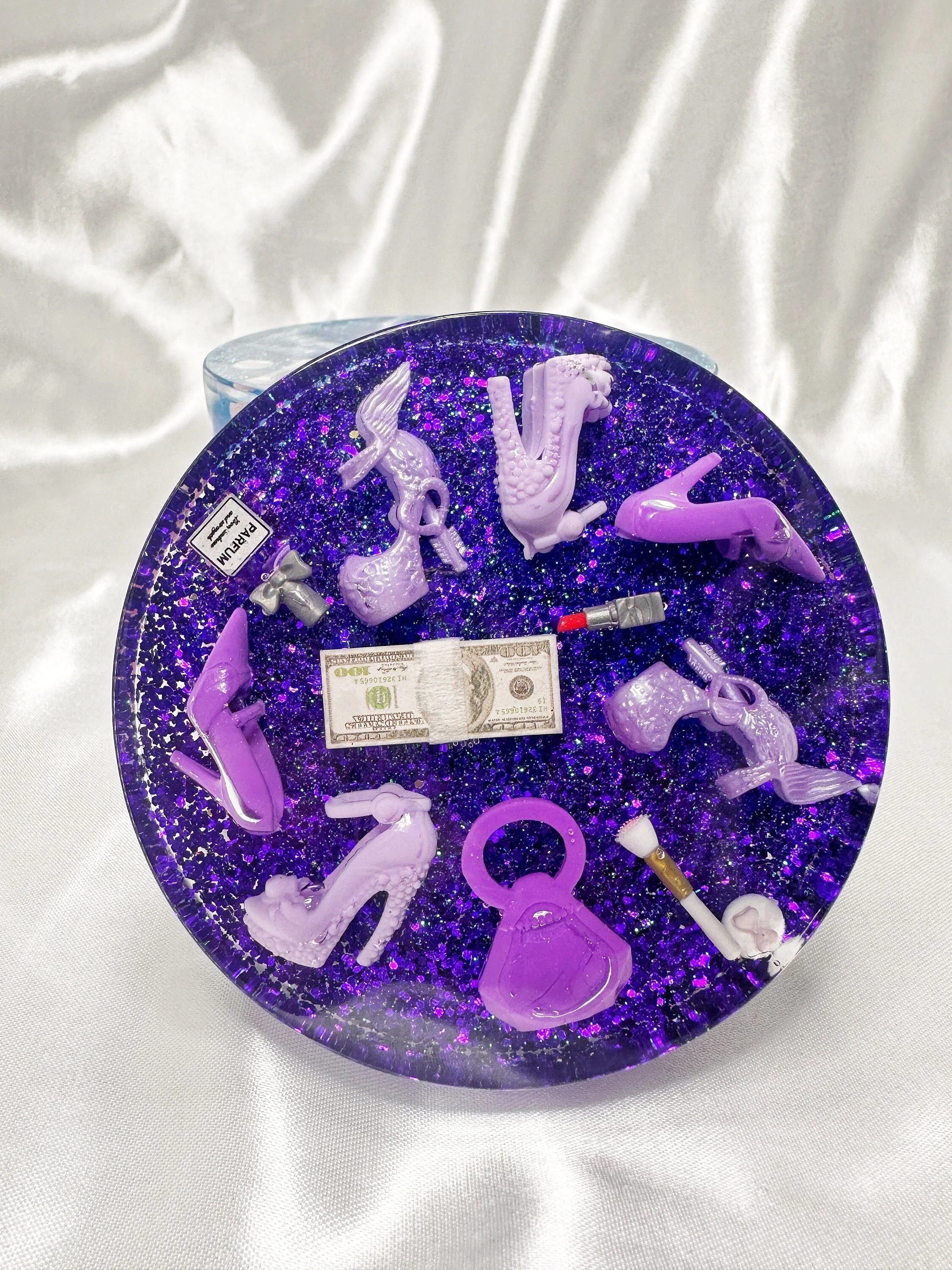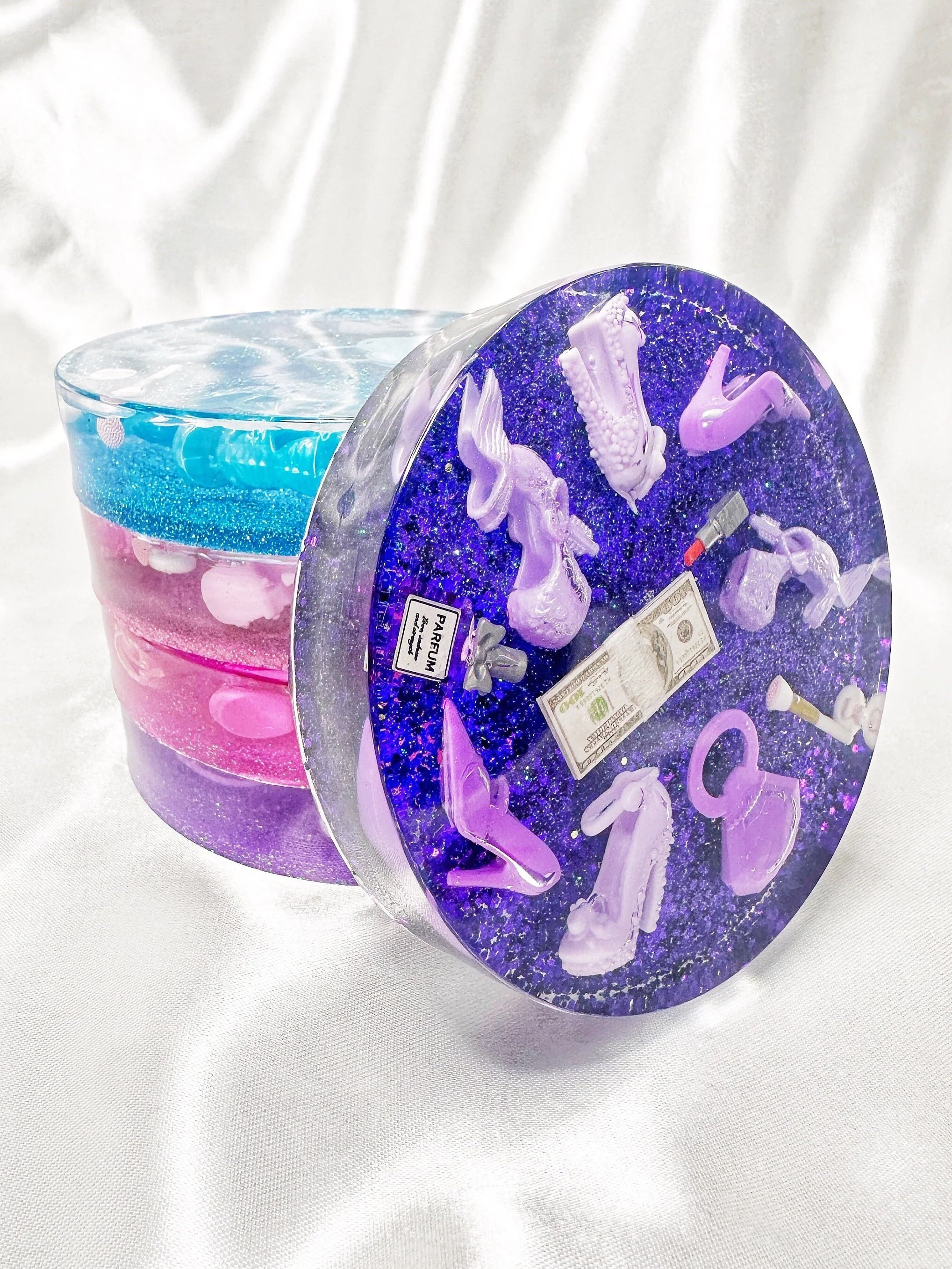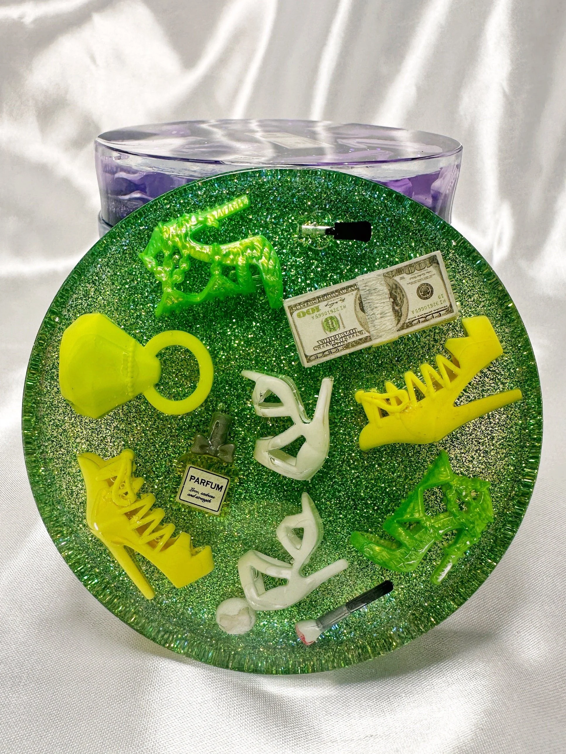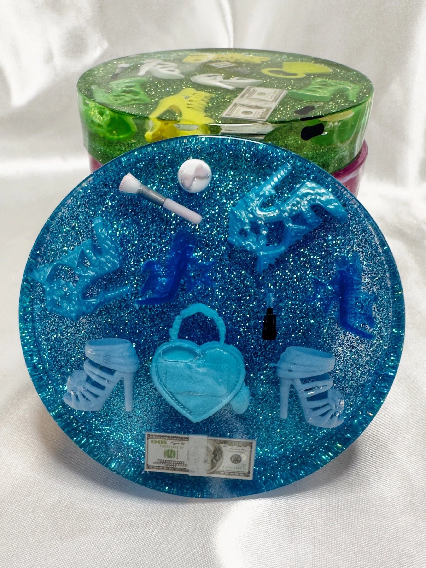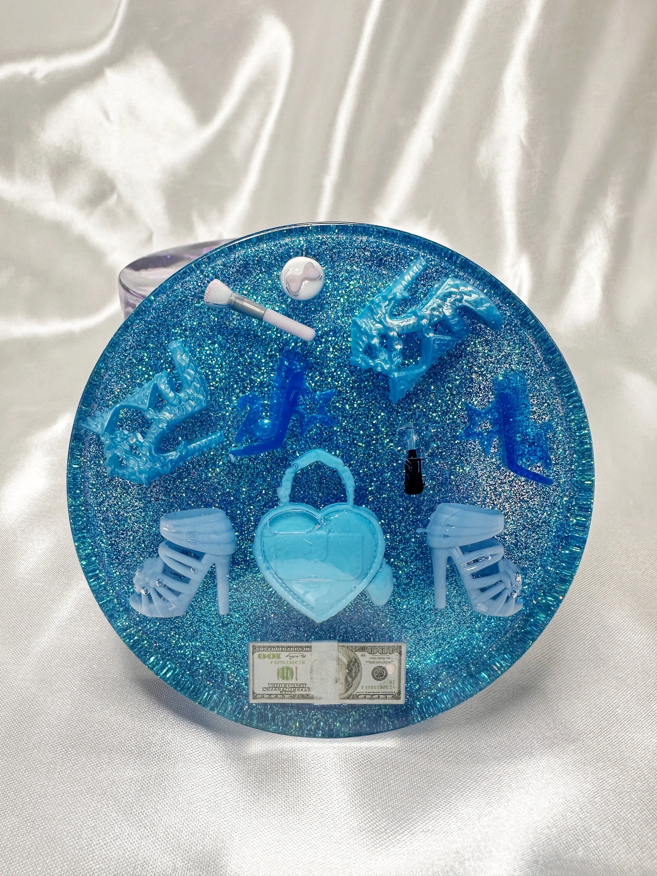 Add some quirky charm to your coffee table with this unique resin coaster featuring heels, accessories and cosmetics. Adorned with a glitter back! ✨