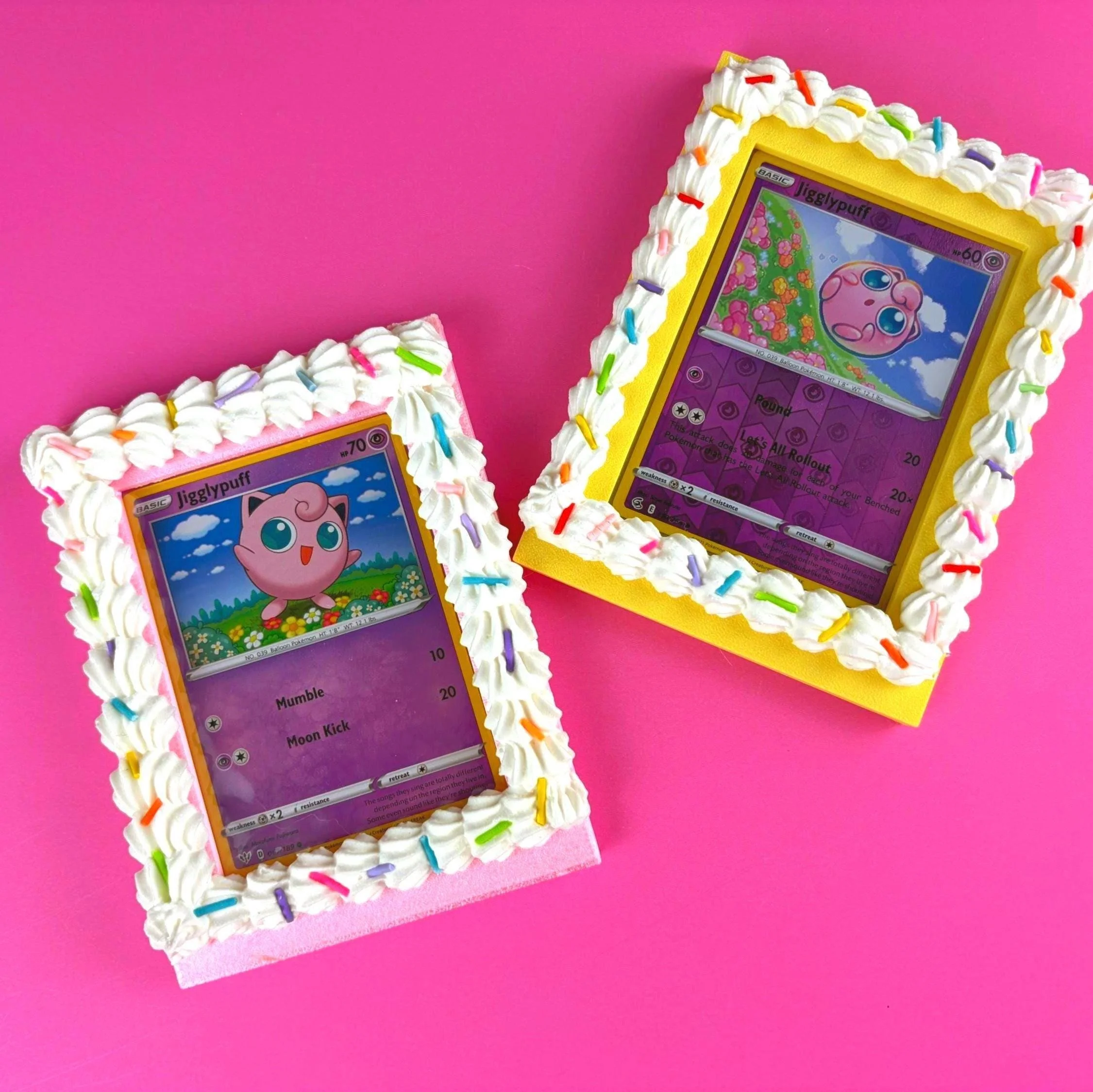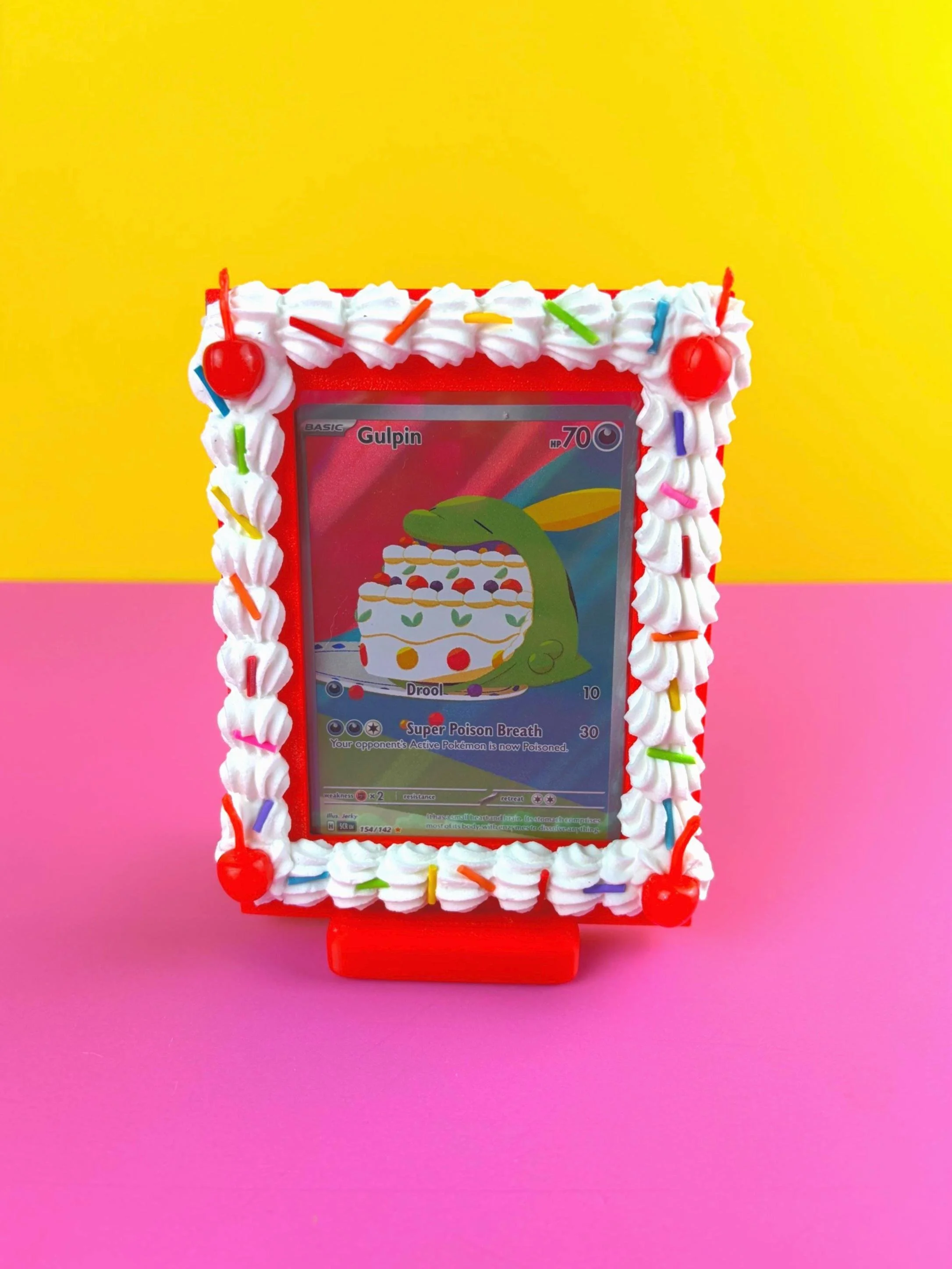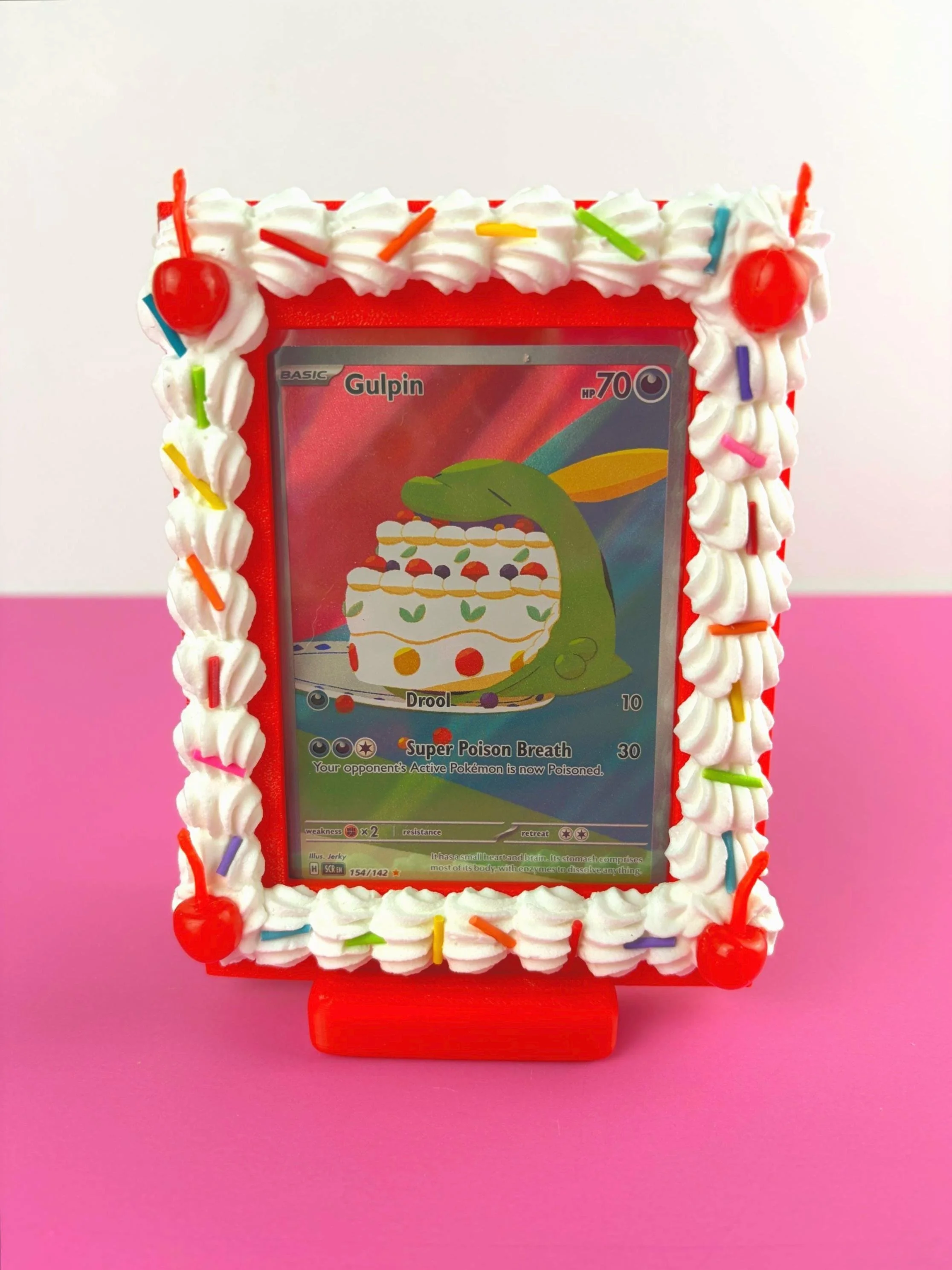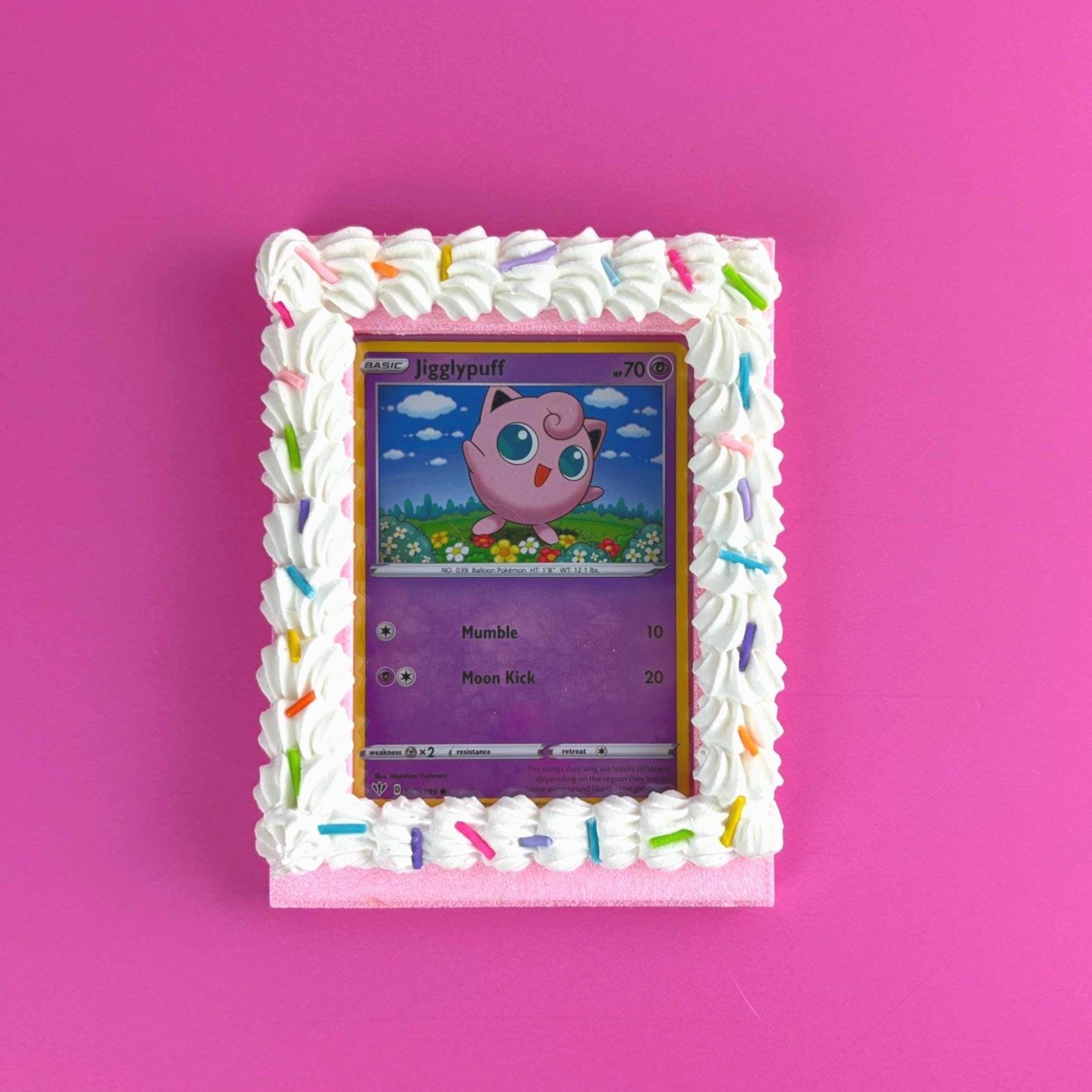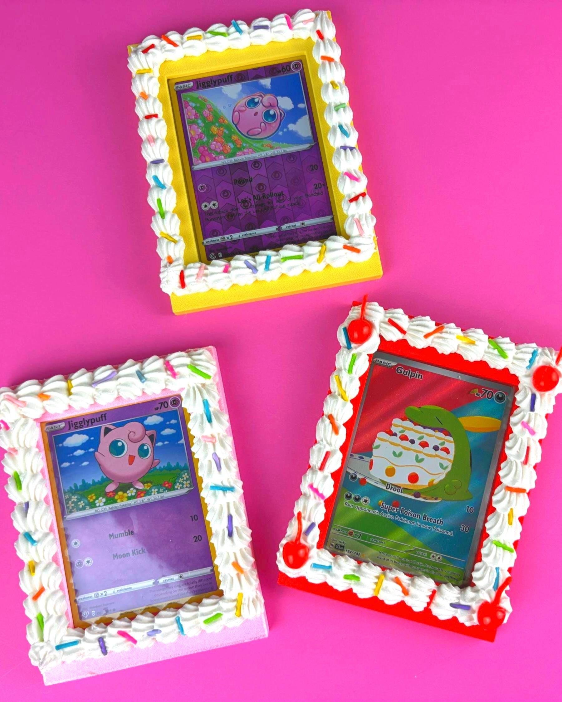 This fake icing trading card frame is designed to hold a standard sleeved Pokémon or TCG card and turn it into playful wall decor. Whether you’re styling a kawaii room, gallery wall, or creative desk space, this dessert-inspired frame makes your collection part of your aesthetic.