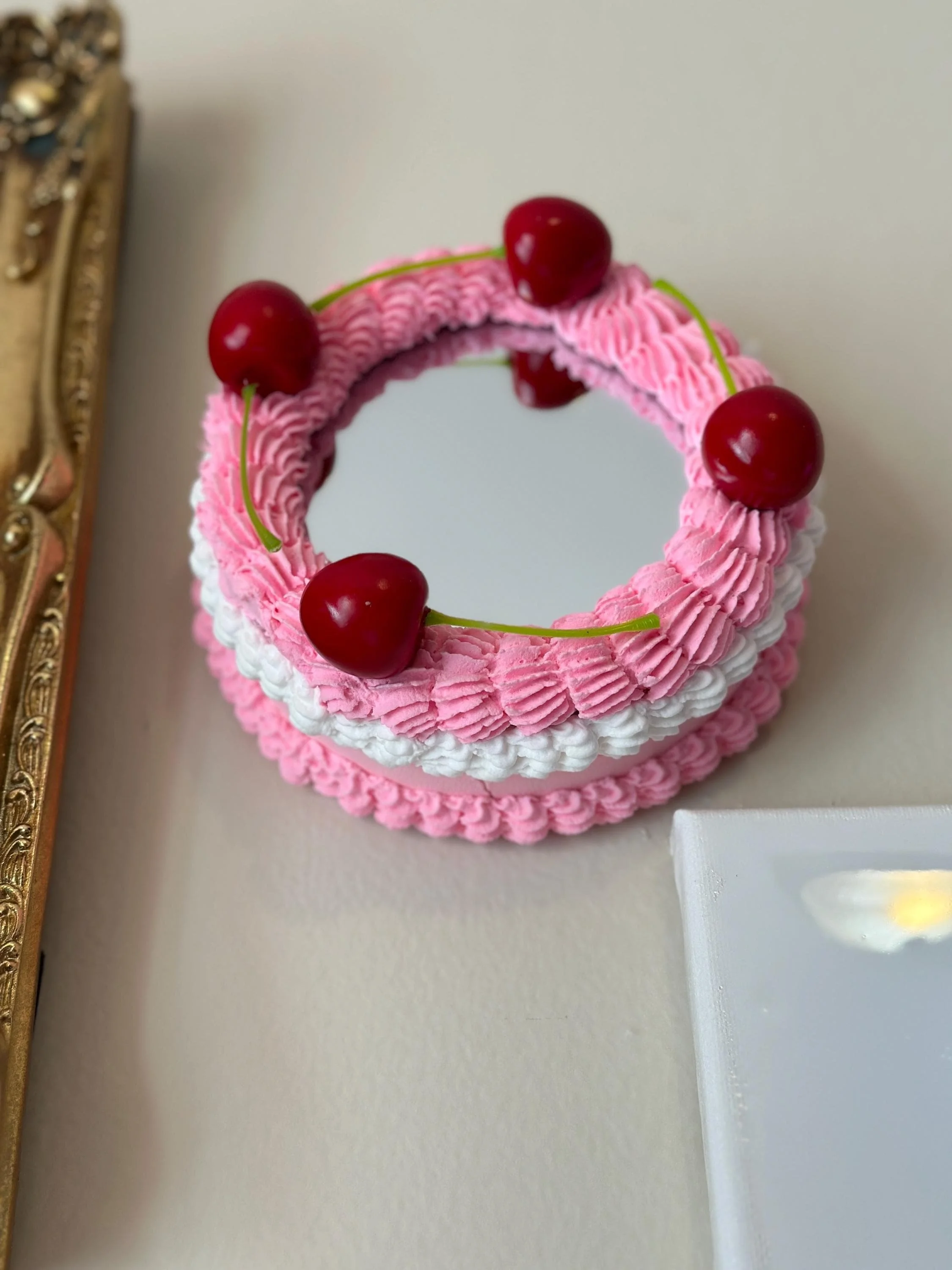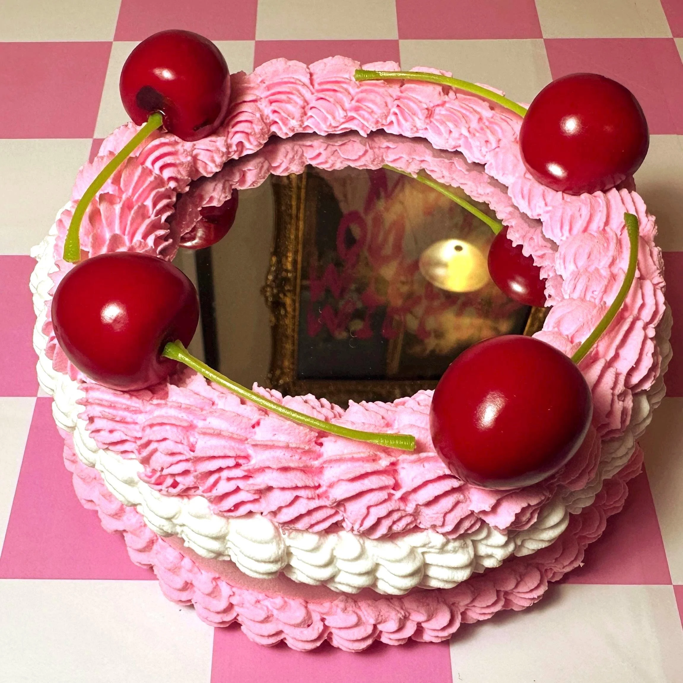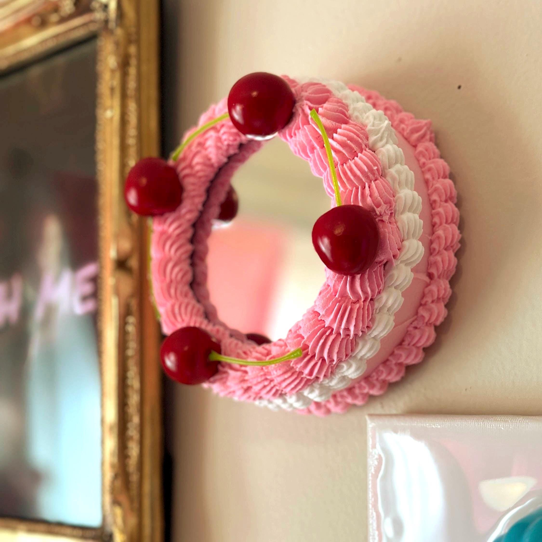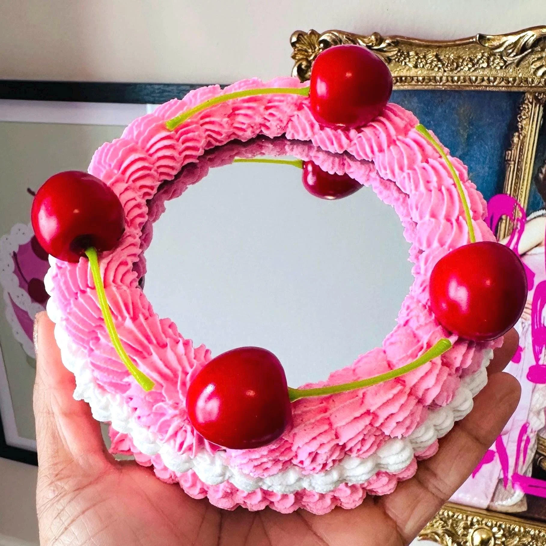 Add a sweet touch to your space with this charming fake cake mirror adorned with faux icing, pearls, cherries, sprinkles, and bows. Perfect for wall mounting with double-sided tape or displaying on a shelf.