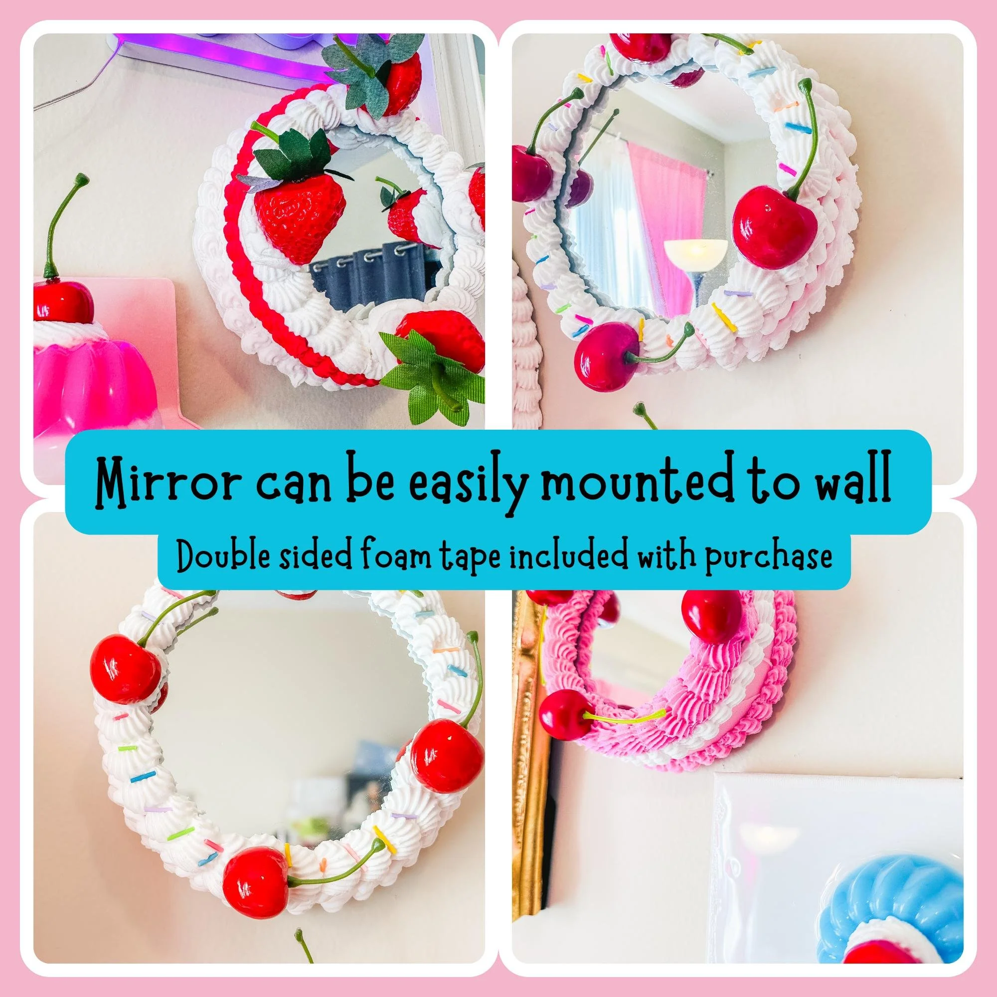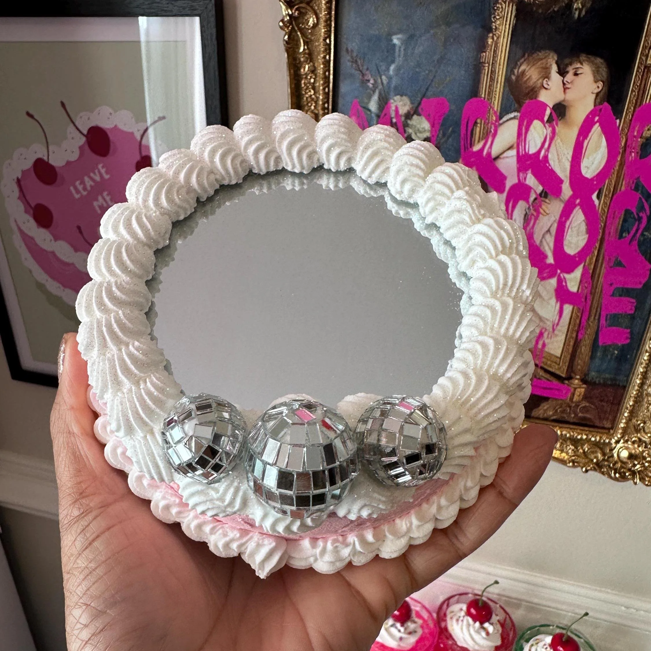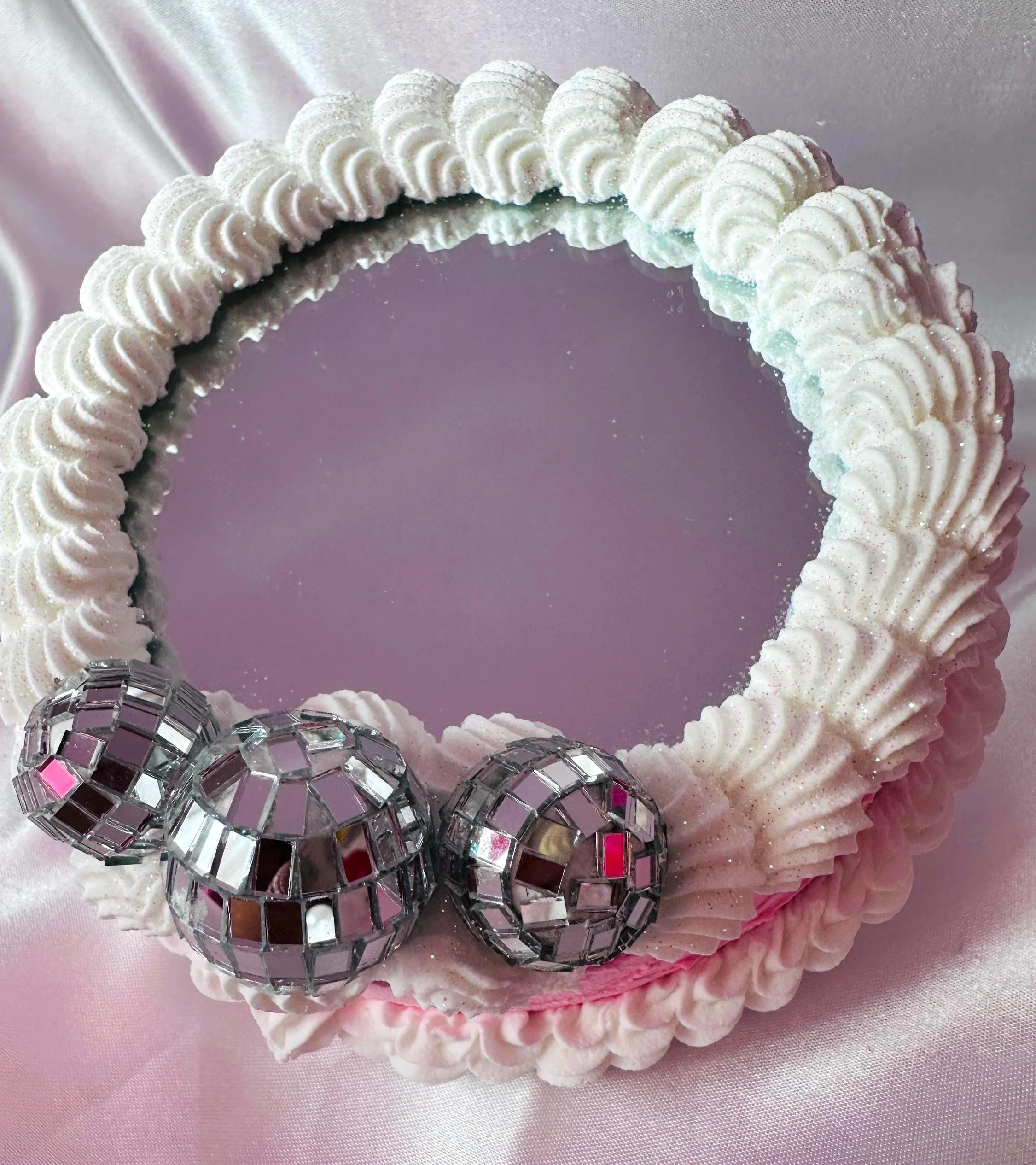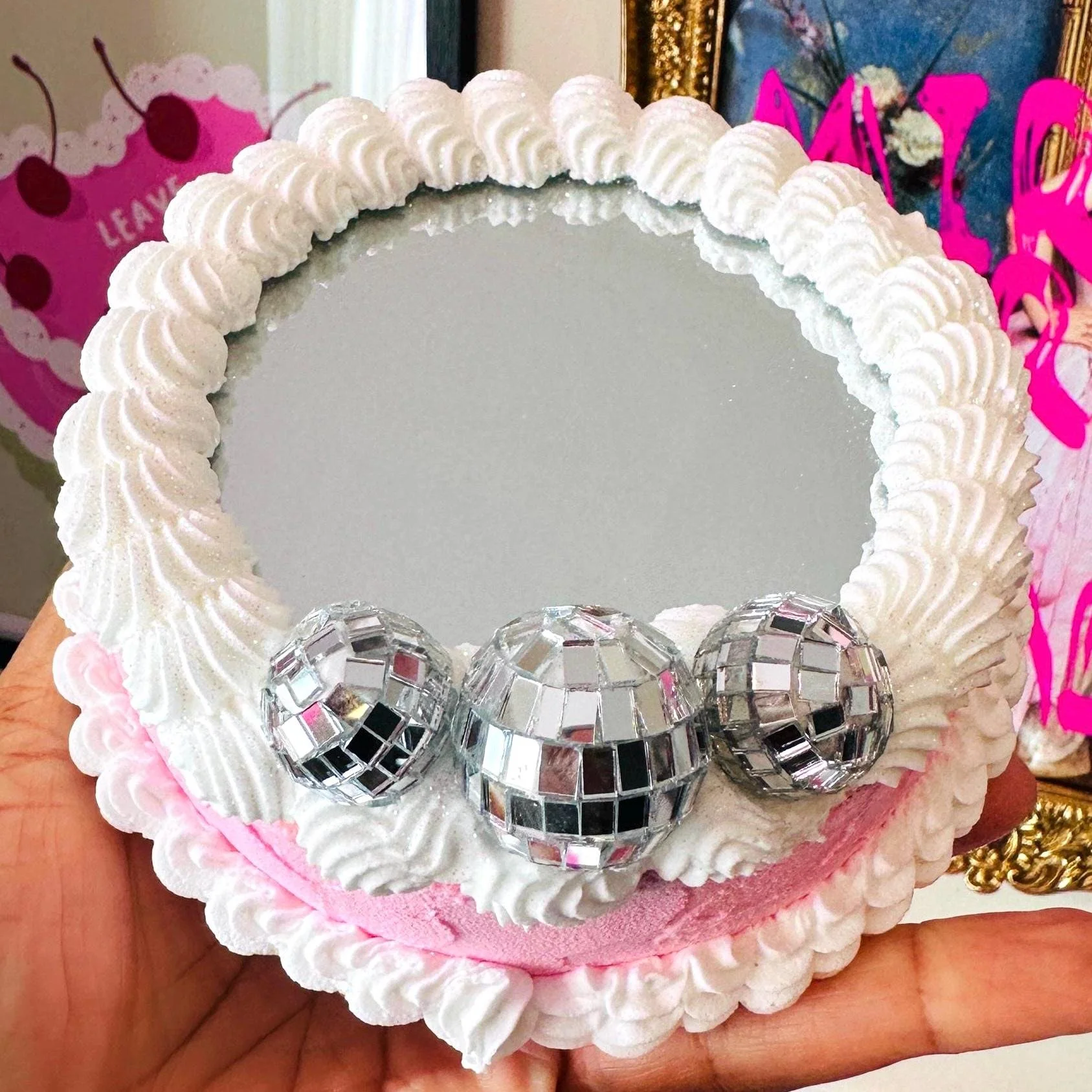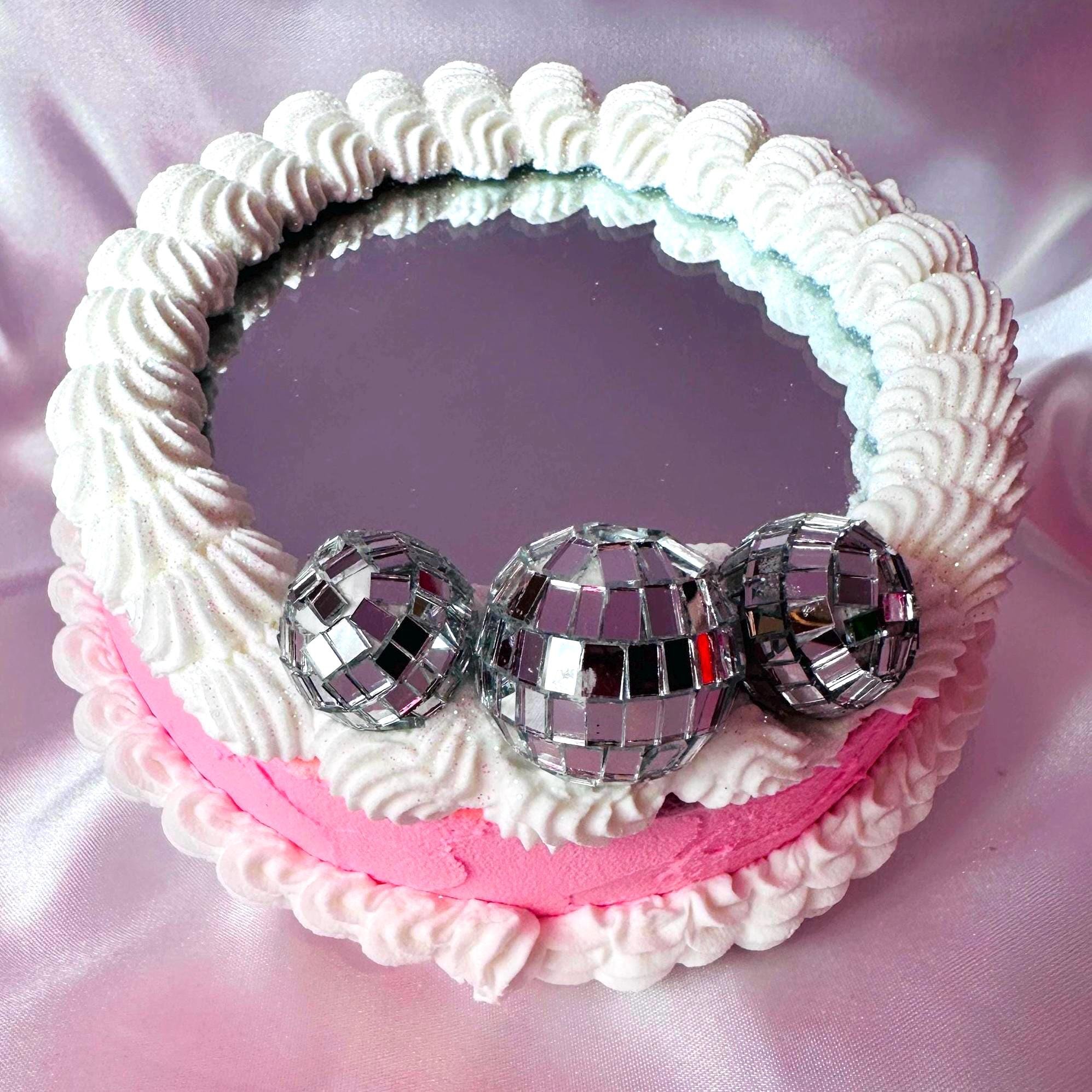Store › Faux Icing Cake Mirror: Disco Balls & Pink Ribbons - Dopamine Decor Image 1 of 7 Image 2 of 7 Image 3 of 7 Image 4 of 7 Image 5 of 7 Image 6 of 7 Image 7 of 7 Faux Icing Cake Mirror: Disco Balls & Pink Ribbons - Dopamine Decor $35.00 Add a tasty touch to your space with this charming fake cake mirror adorned with faux white icing, pearls, roses and pink satin ribbons. Perfect for wall mounting with double-sided tape or displaying on a shelf. A fun and unique piece to brighten up any room!Size without Cherries or strawberries is roughly: 6 inch radius and 2 inches tallIncludes double sided tape which can be used to mount to walls or any other flat non-porous surface.This item is handmade and made have slight imperfections which makes each piece unique!*Please note the cubicle mount version has sharp prongs that go into cubicle material. Please watch your fingers when inserting into cubicle*Please keep away from water or excessive moisture. Quantity: Add To Cart Added! Add a tasty touch to your space with this charming fake cake mirror adorned with faux white icing, pearls, roses and pink satin ribbons. Perfect for wall mounting with double-sided tape or displaying on a shelf. A fun and unique piece to brighten up any room!Size without Cherries or strawberries is roughly: 6 inch radius and 2 inches tallIncludes double sided tape which can be used to mount to walls or any other flat non-porous surface.This item is handmade and made have slight imperfections which makes each piece unique!*Please note the cubicle mount version has sharp prongs that go into cubicle material. Please watch your fingers when inserting into cubicle*Please keep away from water or excessive moisture.