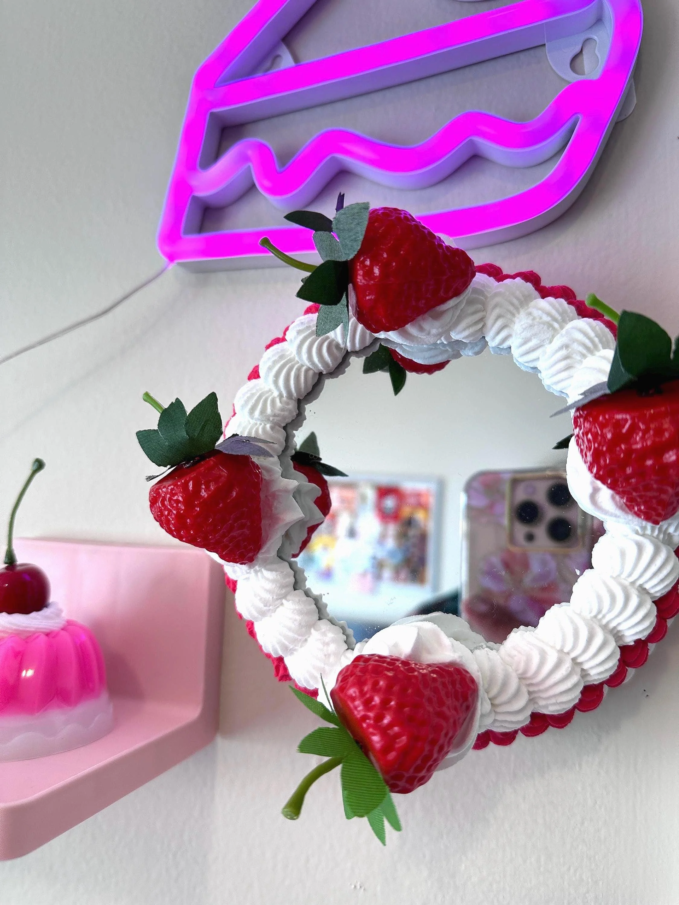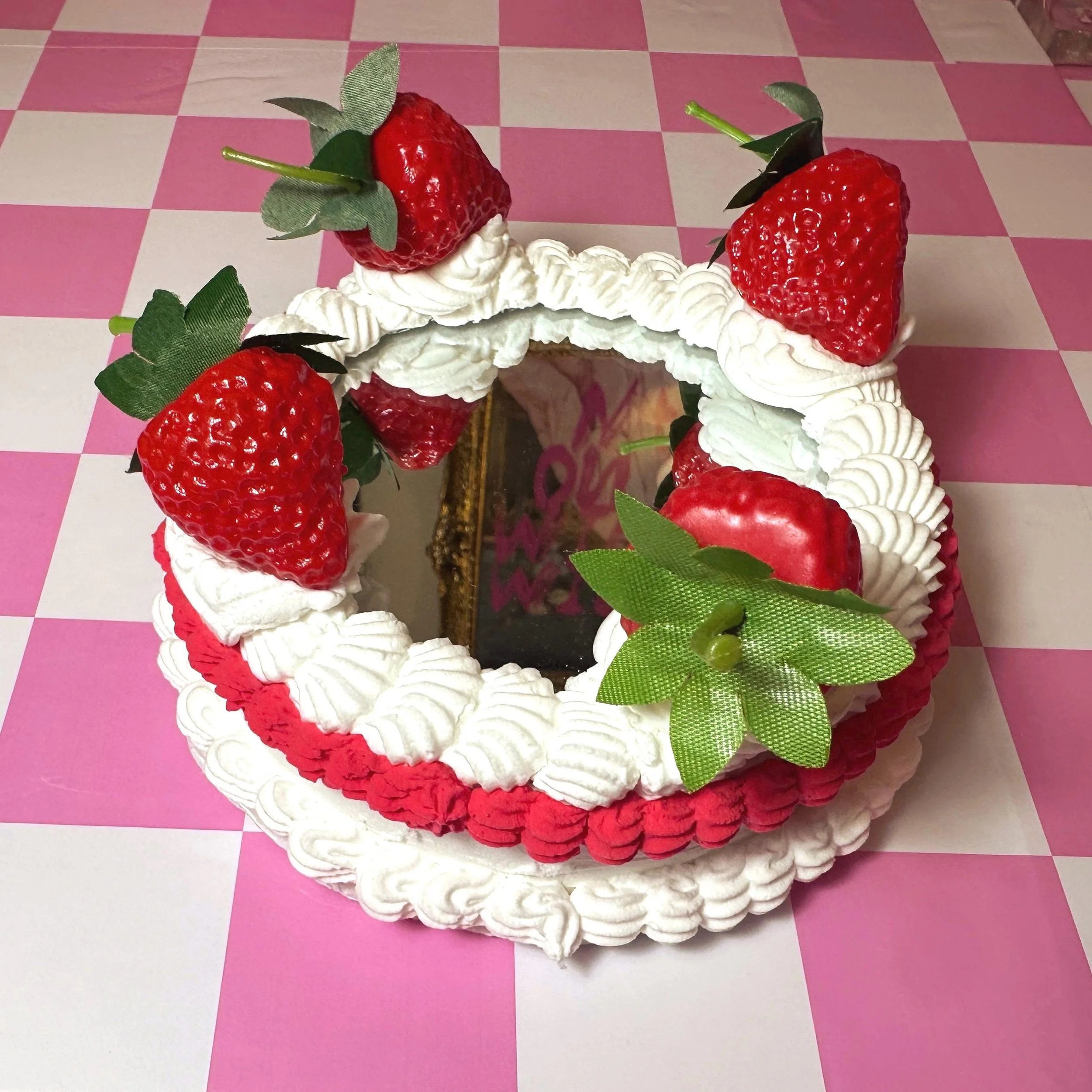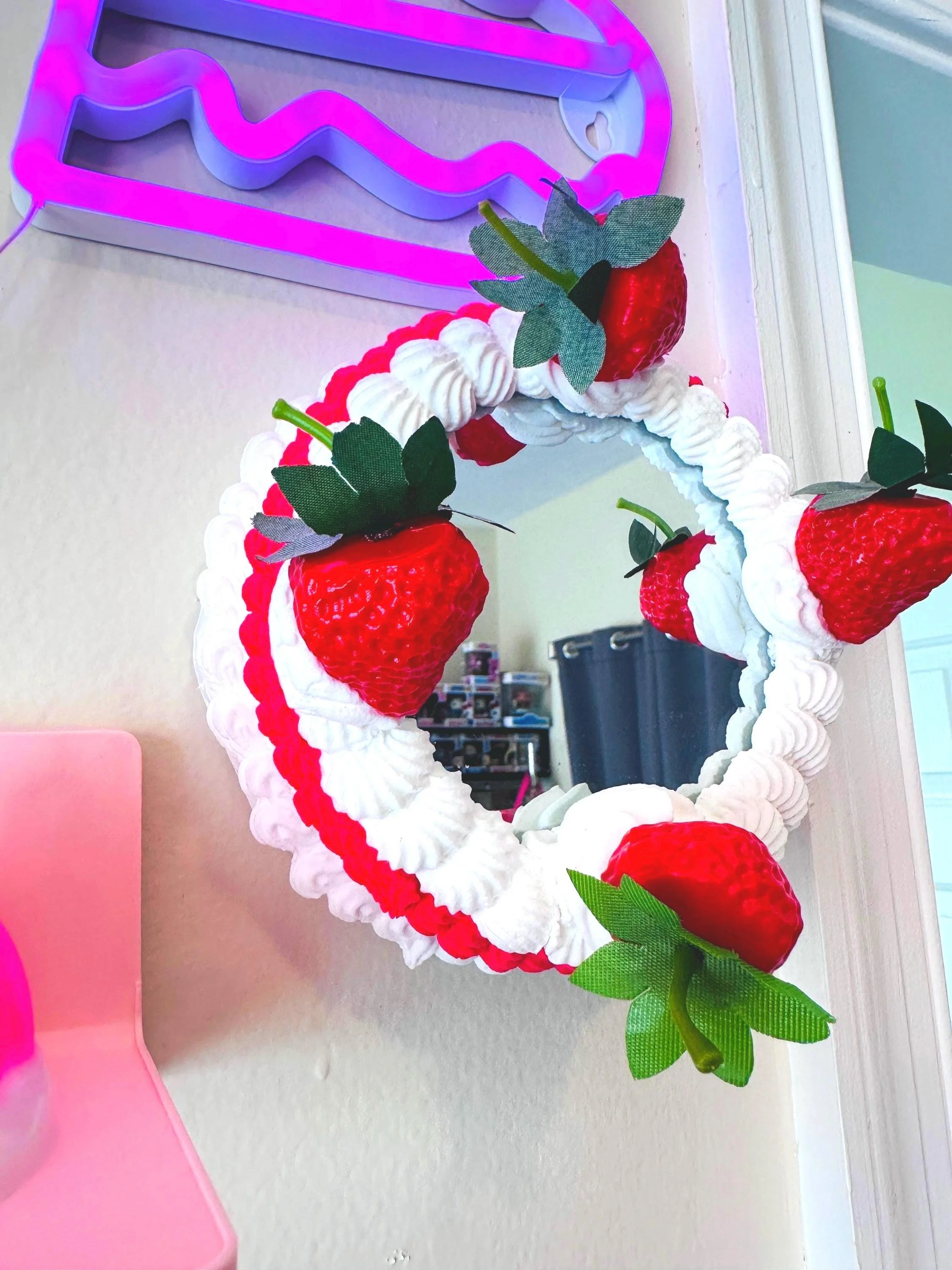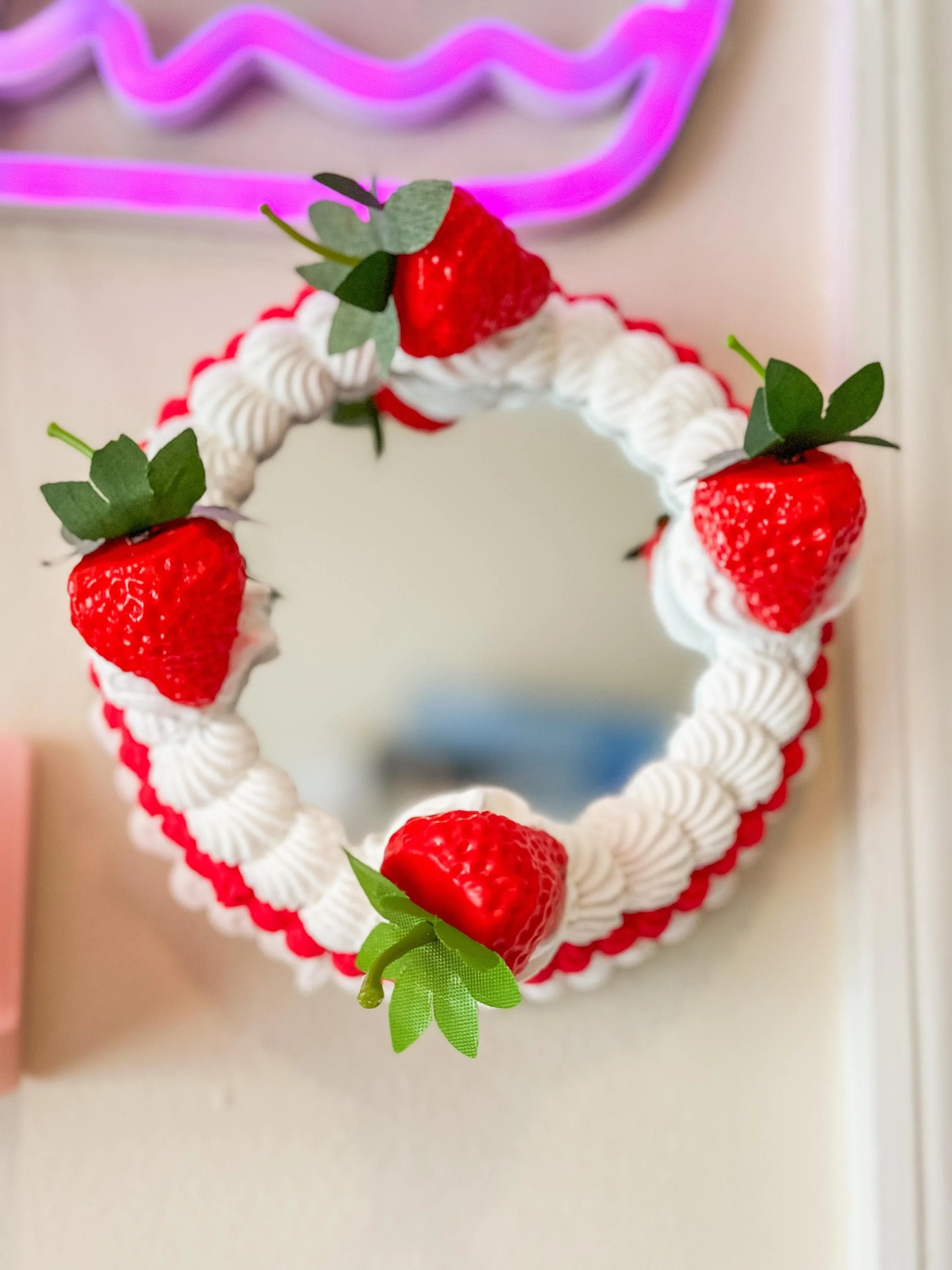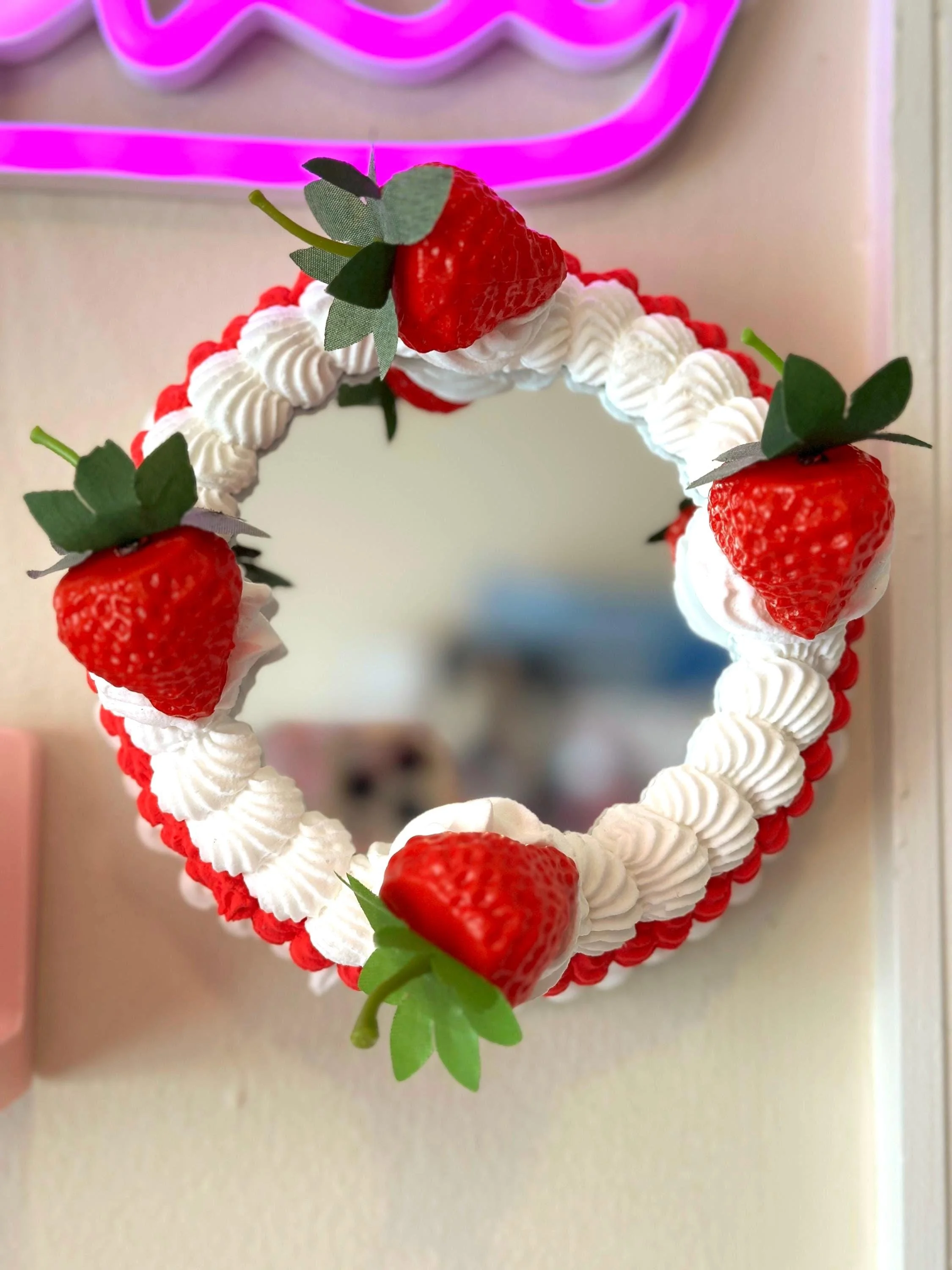 Add some sweetness to your space with this charming fake cake mirror adorned with faux red and white icing with strawberries.