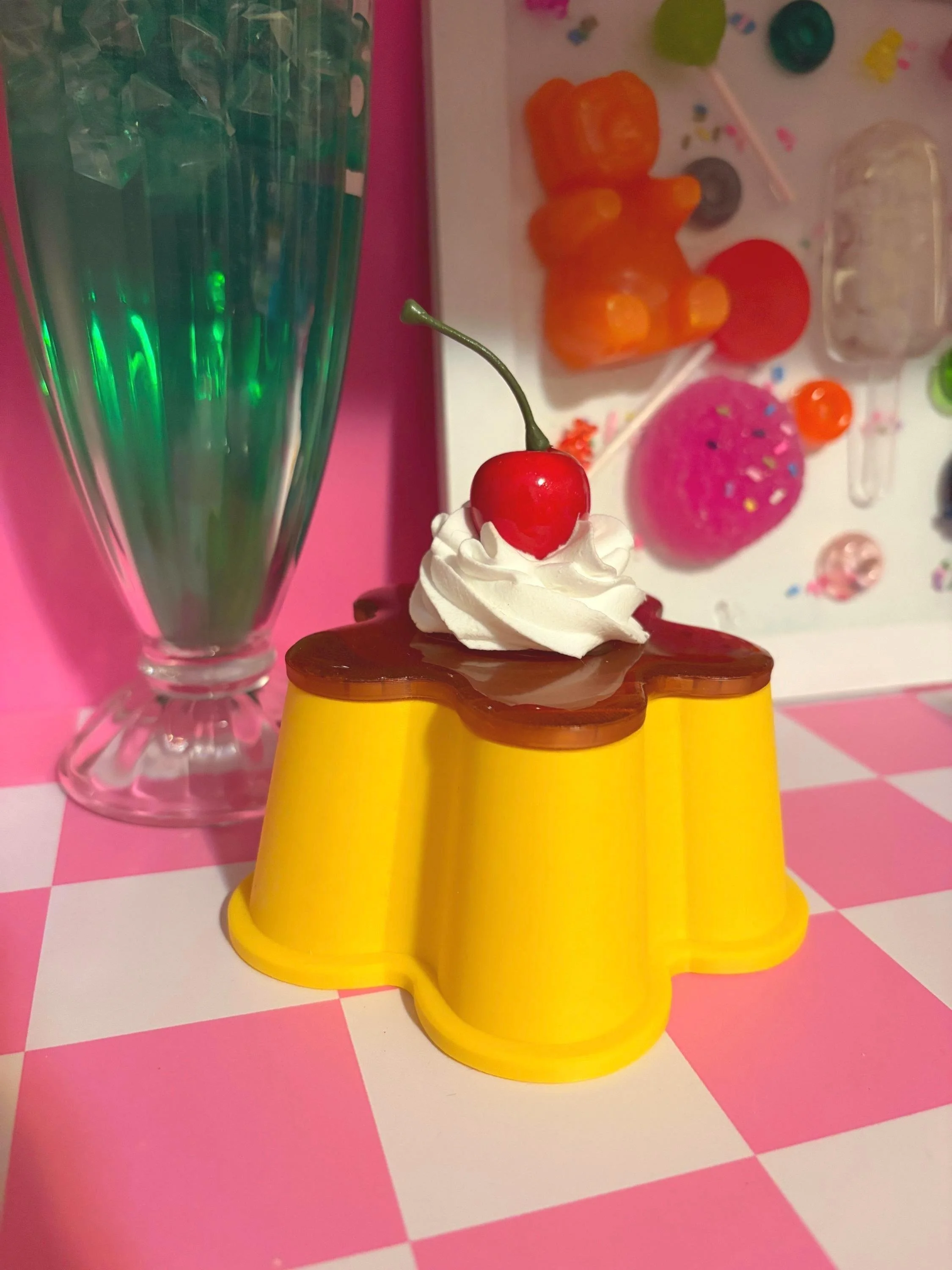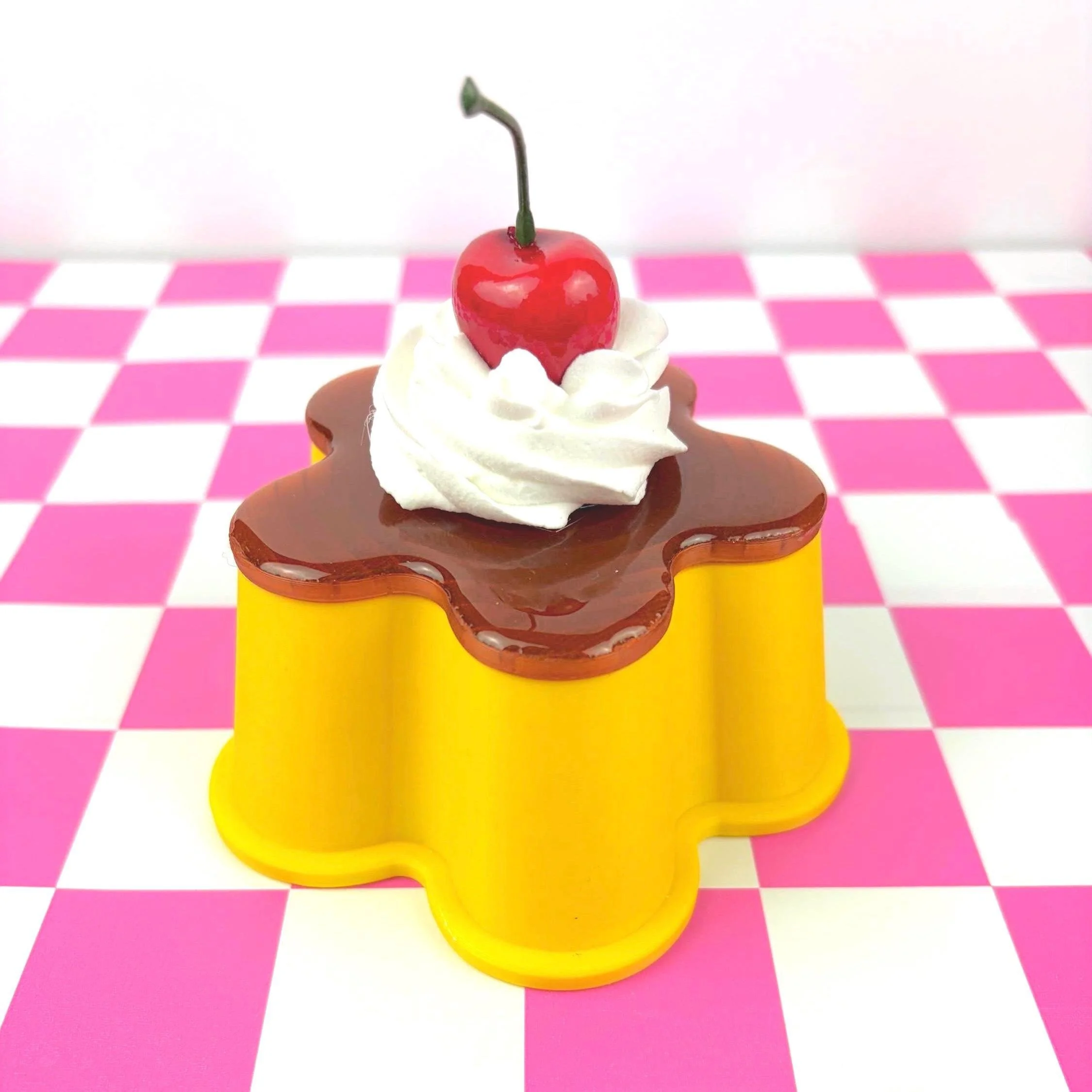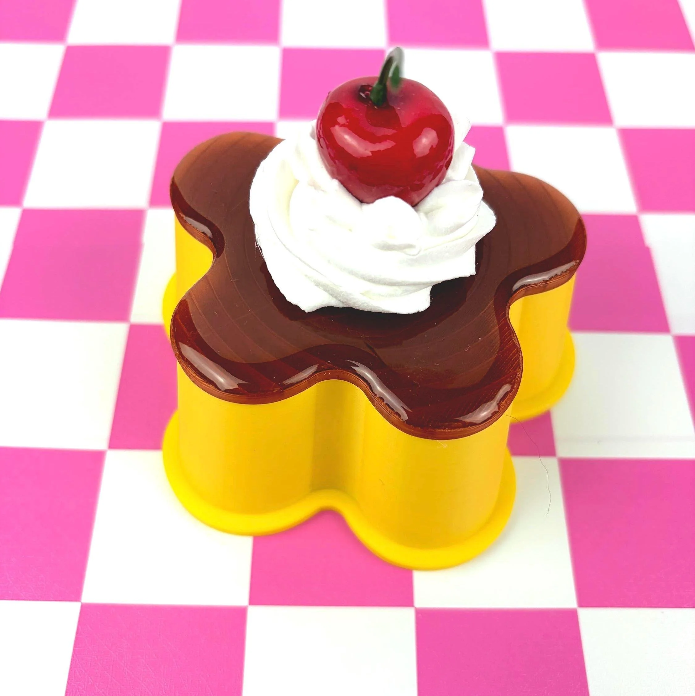 This delightful container is 3D printed & topped with a resin lid, designed to resemble delicious pudding. Complete with a faux cherry on top and a dollop of whip cream, this charming piece adds a touch of fun to your vanity or bedside table.