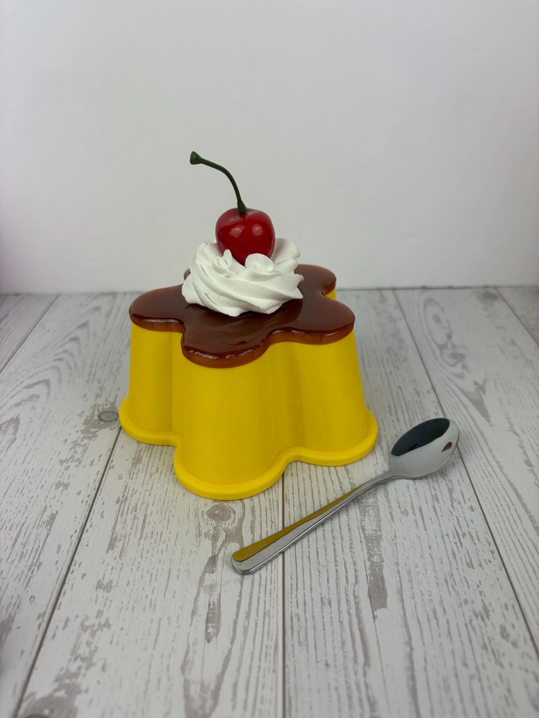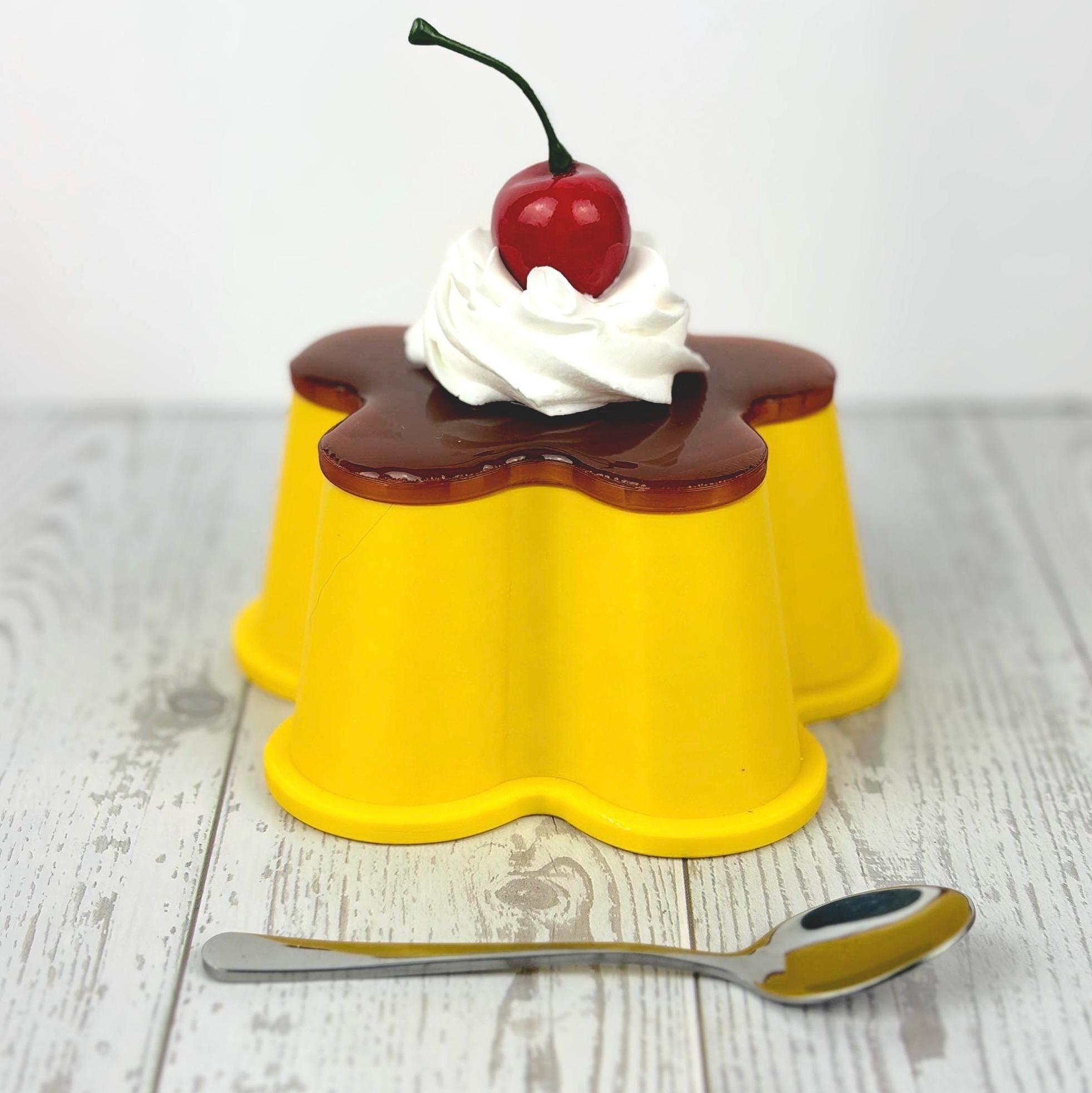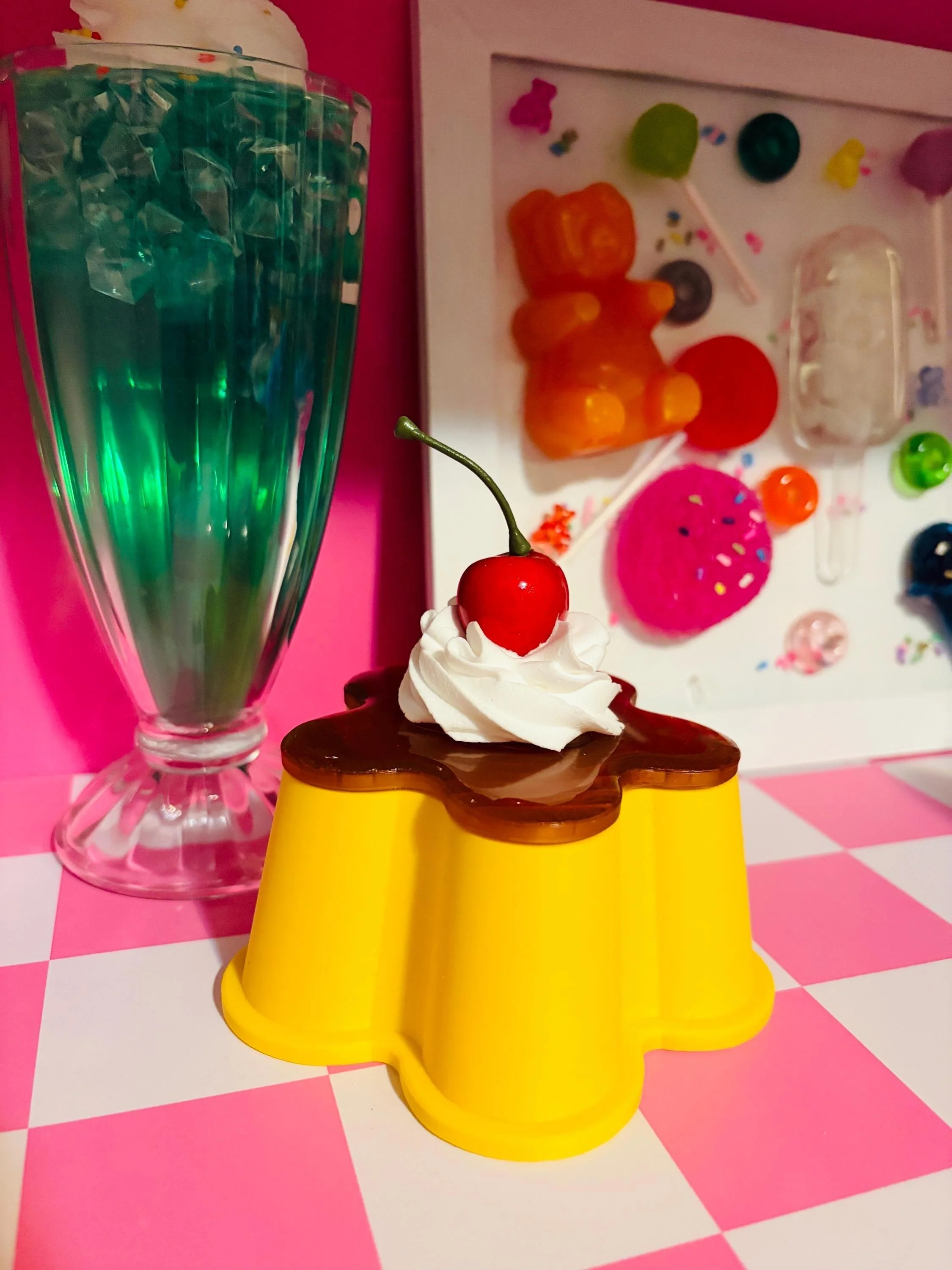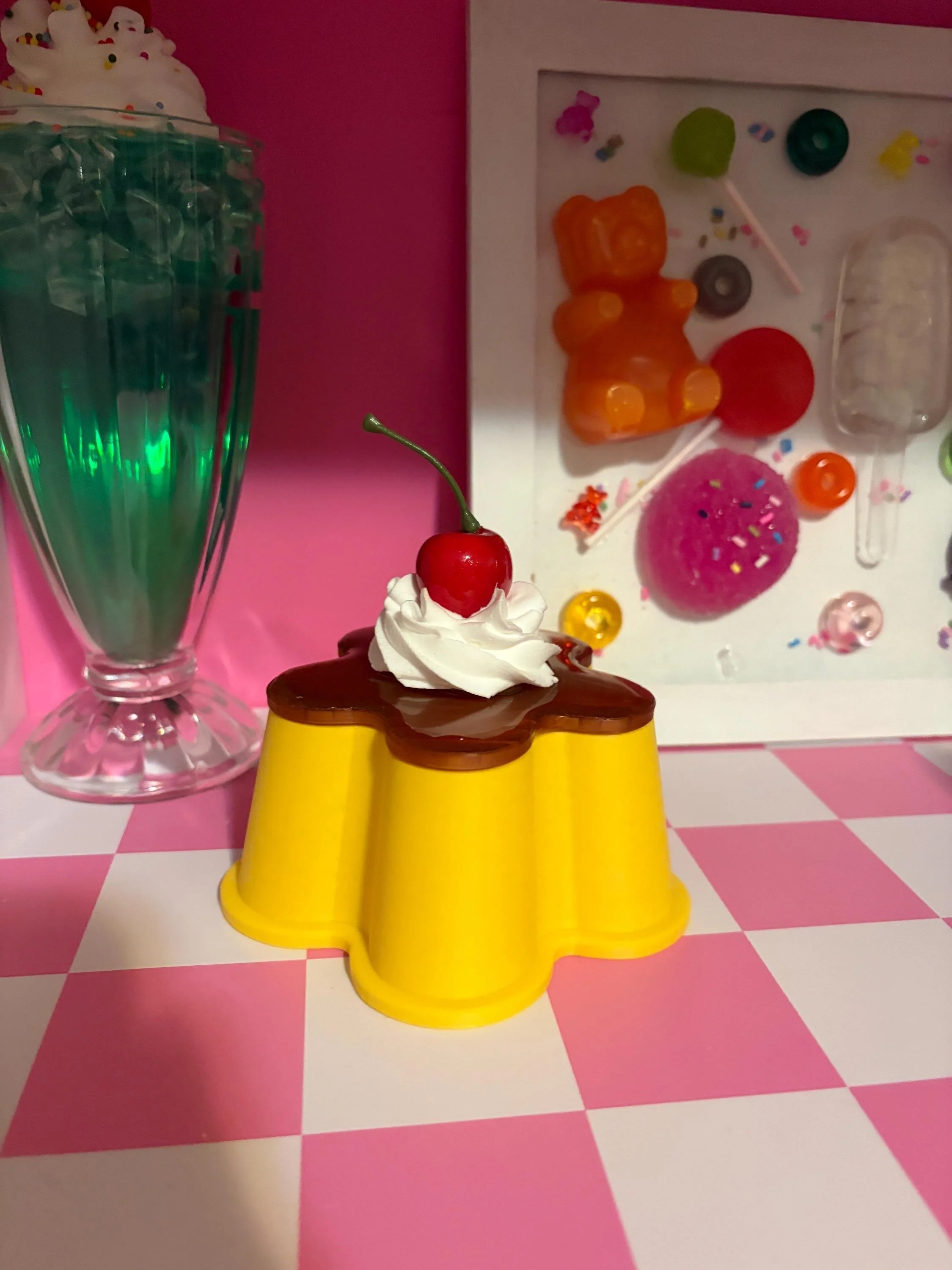 This delightful container is 3D printed & topped with a resin lid, designed to resemble delicious pudding. Complete with a faux cherry on top and a dollop of whip cream, this charming piece adds a touch of fun to your vanity or bedside table.