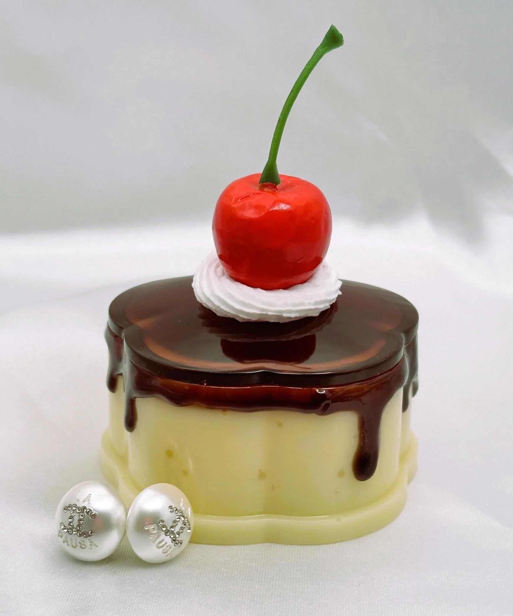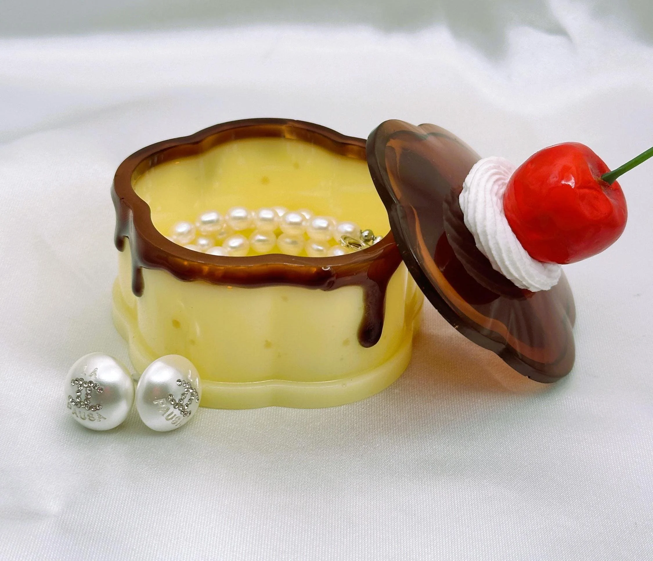 This delightful container is expertly crafted from resin, designed to resemble a delicious pudding with decadent chocolate dripping down the sides. Complete with a faux cherry on top and a dollop of whip cream, this charming piece adds a touch of fun to your vanity or bedside table.