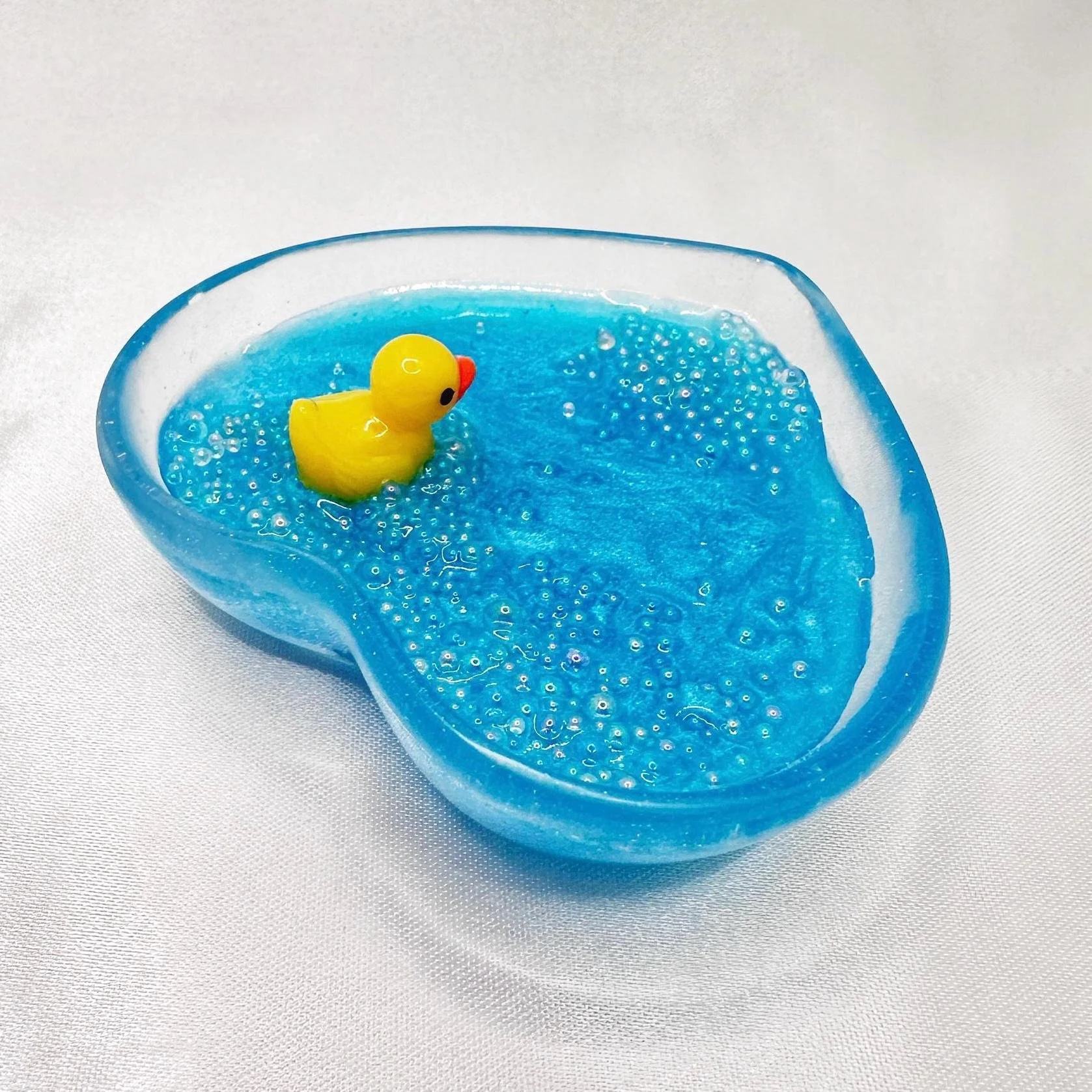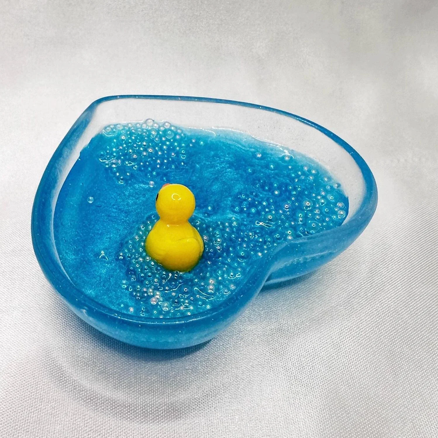 Store › Handmade Heart Shaped Dish with Rubber Duck in Bubble Bath Image 1 of 7 Image 2 of 7 Image 3 of 7 Image 4 of 7 Image 5 of 7 Image 6 of 7 Image 7 of 7 Handmade Heart Shaped Dish with Rubber Duck in Bubble Bath $24.99 Pamper your jewelry with this adorable heart-shaped ring dish featuring a rubber duck floating in a luxurious bubble bath! Keep your favorite rings safe and organized in this unique dish, perfect for adding a touch of fun to your vanity or bedside table.This handcrafted resin dish is both functional and stylish, making it a delightful gift for any duck lover or jewelry enthusiast.Make a splash with this delightful rubber duck in bubble bath heart-shaped ring dish!Heart shaped dish is made of resin, which may include slight imperfections. Dimensions: Length 2.5 inches x Width 3 inches x Height roughly .75 inches Add To Cart Added! Pamper your jewelry with this adorable heart-shaped ring dish featuring a rubber duck floating in a luxurious bubble bath! Keep your favorite rings safe and organized in this unique dish, perfect for adding a touch of fun to your vanity or bedside table.This handcrafted resin dish is both functional and stylish, making it a delightful gift for any duck lover or jewelry enthusiast.Make a splash with this delightful rubber duck in bubble bath heart-shaped ring dish!Heart shaped dish is made of resin, which may include slight imperfections. Dimensions: Length 2.5 inches x Width 3 inches x Height roughly .75 inches