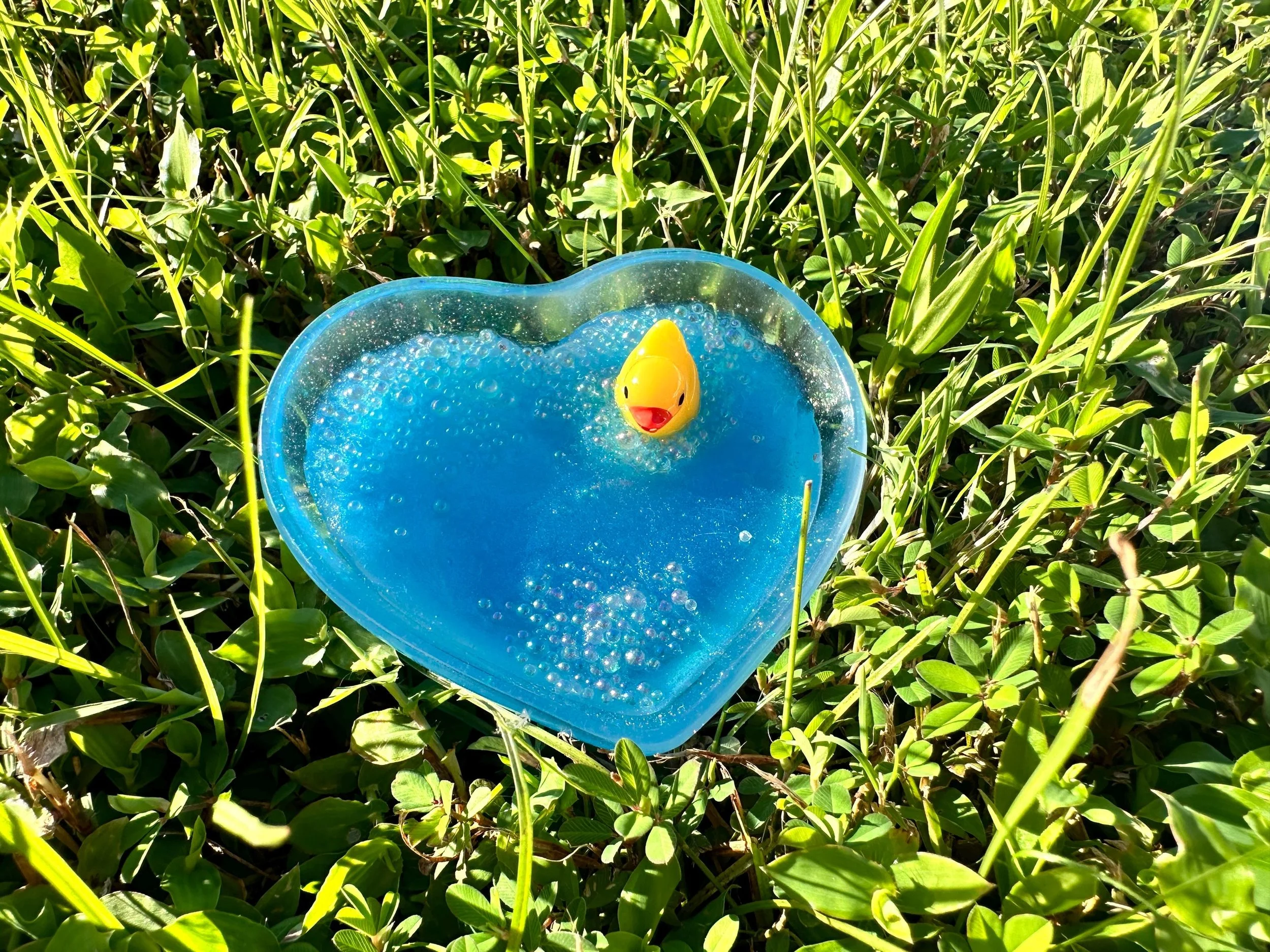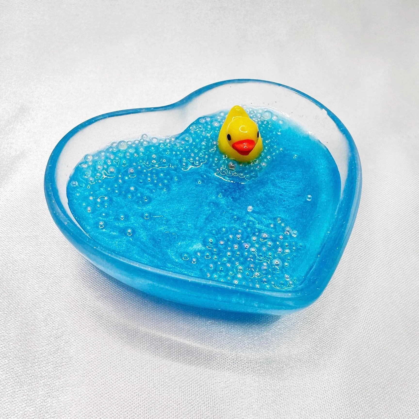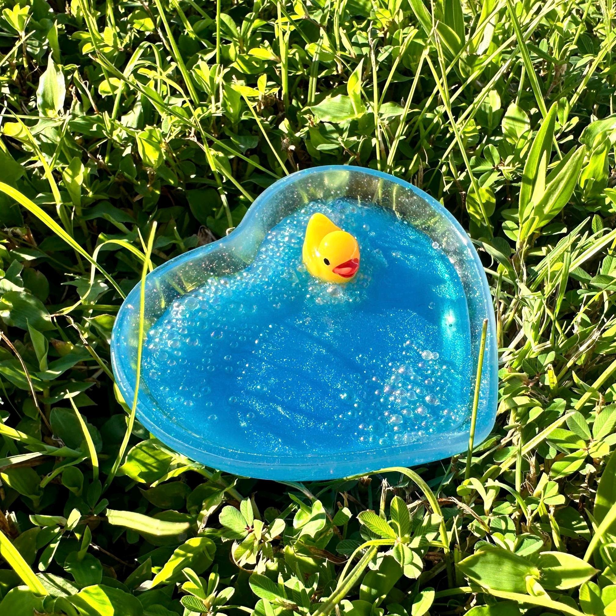 Store › Handmade Heart Shaped Dish with Rubber Duck in Bubble Bath Image 1 of 7 Image 2 of 7 Image 3 of 7 Image 4 of 7 Image 5 of 7 Image 6 of 7 Image 7 of 7 Handmade Heart Shaped Dish with Rubber Duck in Bubble Bath $24.99 Pamper your jewelry with this adorable heart-shaped ring dish featuring a rubber duck floating in a luxurious bubble bath! Keep your favorite rings safe and organized in this unique dish, perfect for adding a touch of fun to your vanity or bedside table.This handcrafted resin dish is both functional and stylish, making it a delightful gift for any duck lover or jewelry enthusiast.Make a splash with this delightful rubber duck in bubble bath heart-shaped ring dish!Heart shaped dish is made of resin, which may include slight imperfections. Dimensions: Length 2.5 inches x Width 3 inches x Height roughly .75 inches Add To Cart Added! Pamper your jewelry with this adorable heart-shaped ring dish featuring a rubber duck floating in a luxurious bubble bath! Keep your favorite rings safe and organized in this unique dish, perfect for adding a touch of fun to your vanity or bedside table.This handcrafted resin dish is both functional and stylish, making it a delightful gift for any duck lover or jewelry enthusiast.Make a splash with this delightful rubber duck in bubble bath heart-shaped ring dish!Heart shaped dish is made of resin, which may include slight imperfections. Dimensions: Length 2.5 inches x Width 3 inches x Height roughly .75 inches